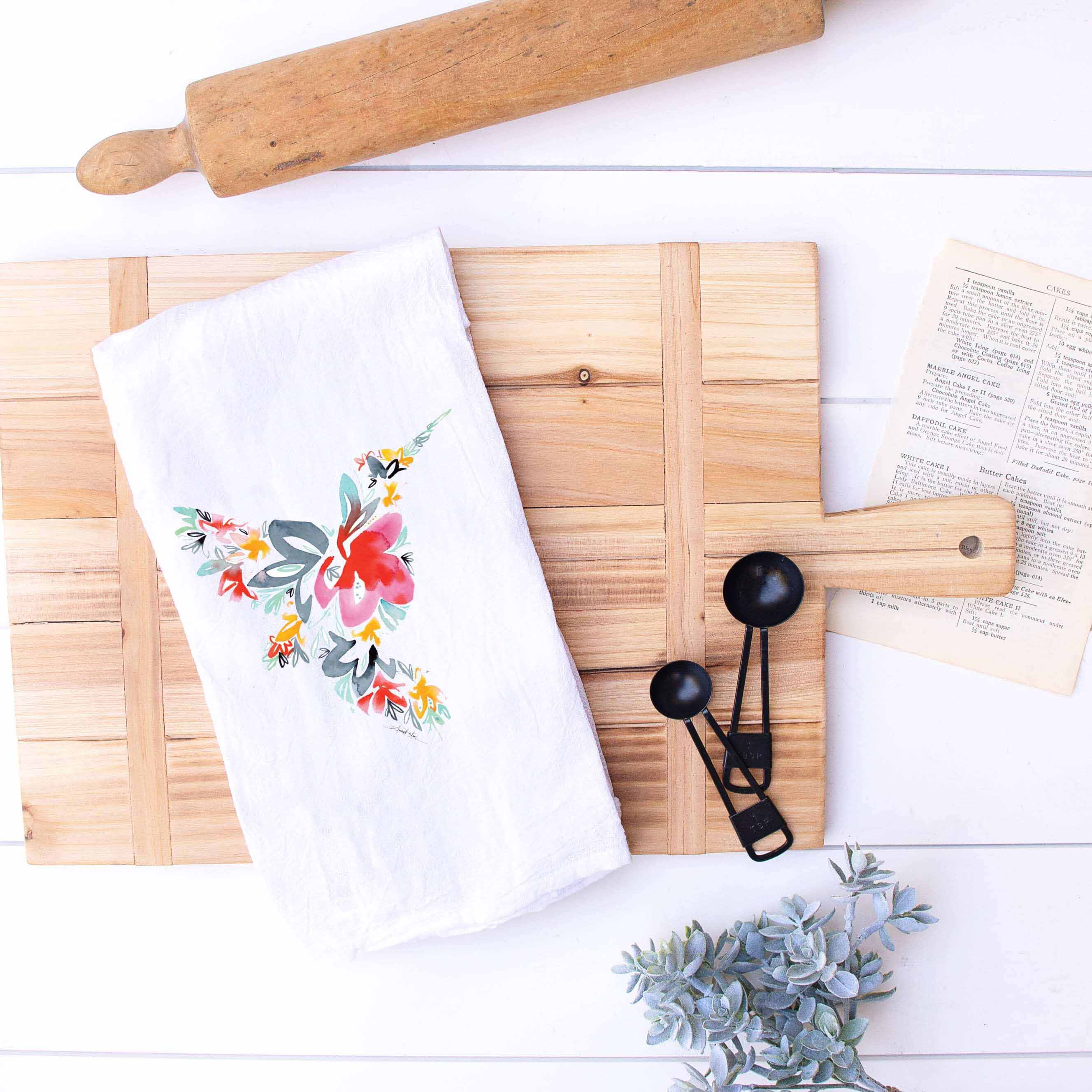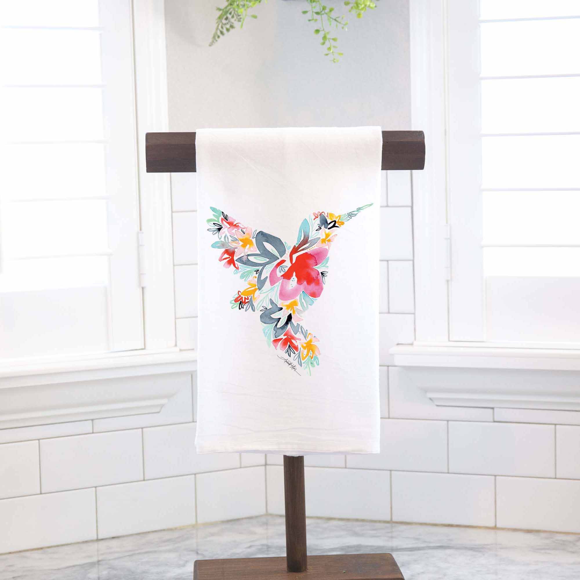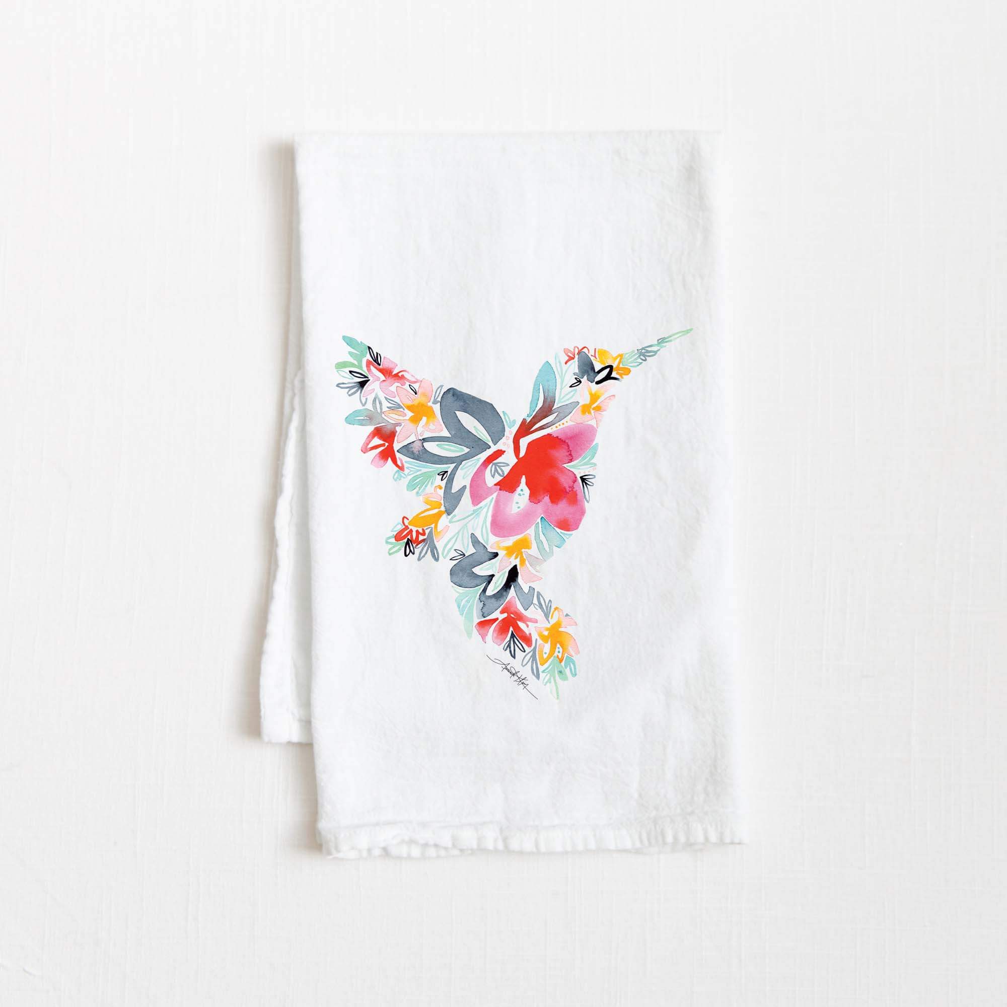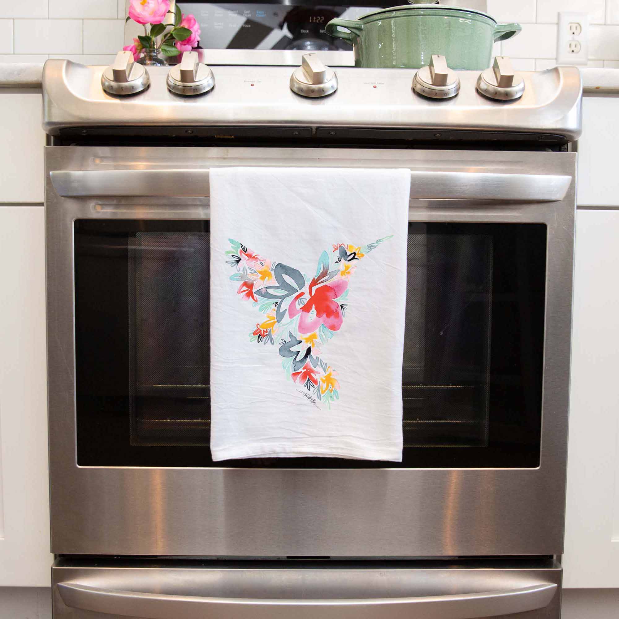 This high quality Hummingbird design flour sack tea towel showcases Amanda Klein's whimsical watercolor and splattered design. A uniquely perfect gift for any hostess, bride, teacher, friend, or loved one.