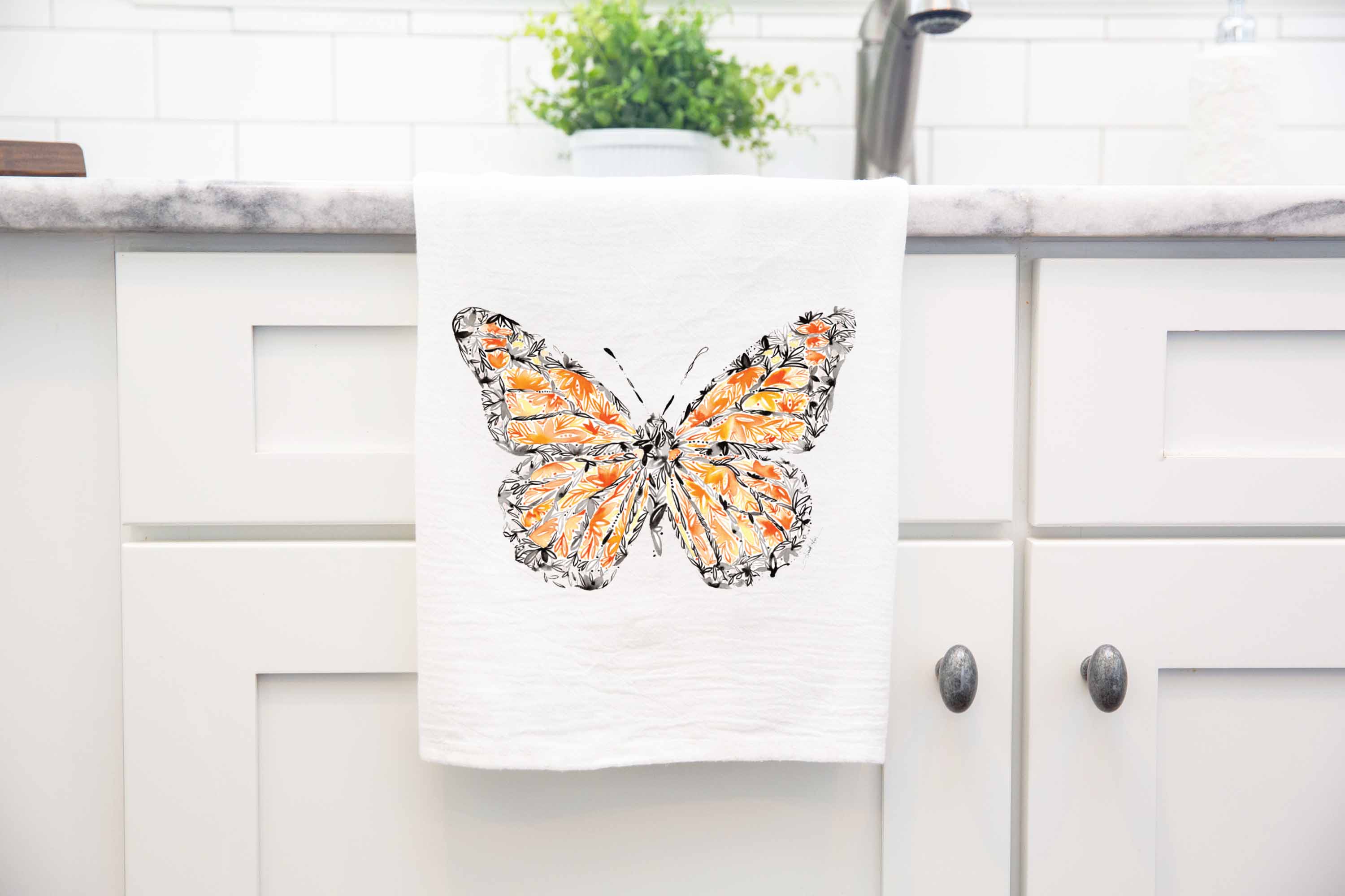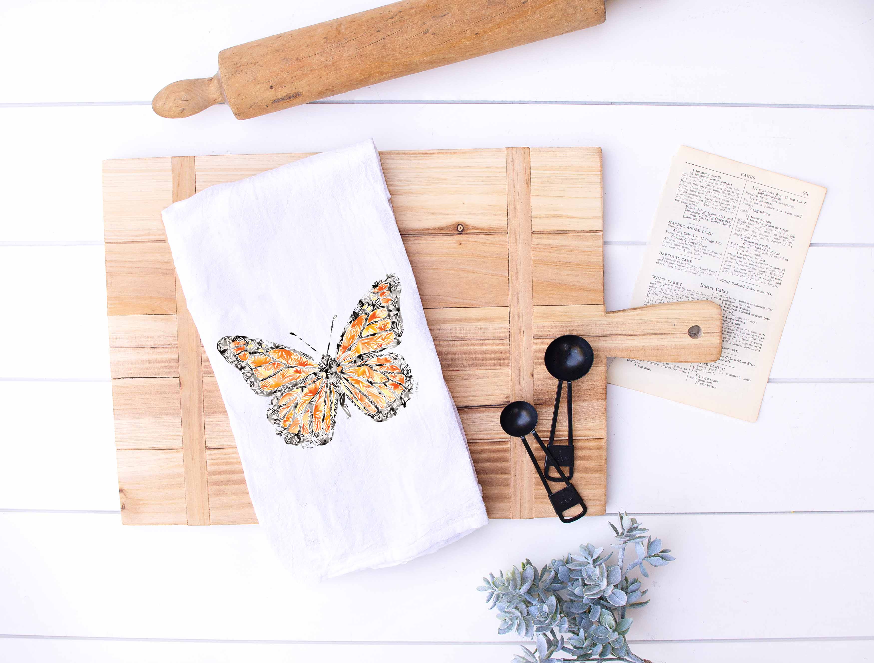 This high quality Monarch Butterfly flour sack tea towel showcases Amanda Klein's whimsical watercolor and splattered design. A uniquely perfect gift for any hostess, bride, teacher, friend, or loved one.