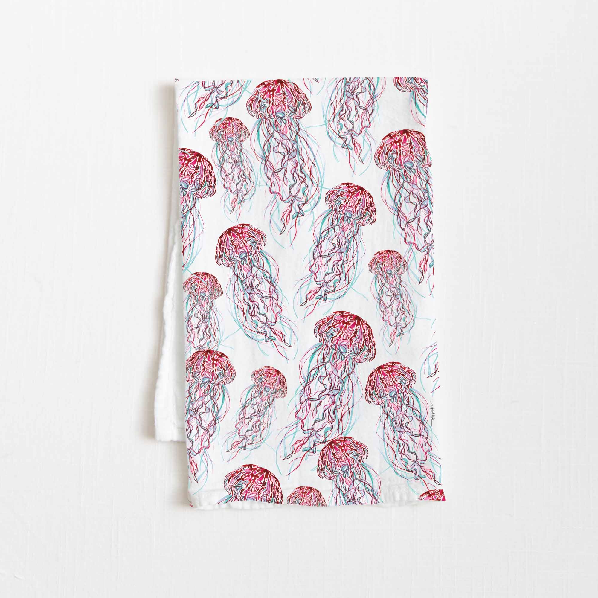 You'll love the newest addition to our marine life collection - The Jellyfish! Our high-quality flour sack tea towel showcases Amanda Klein's whimsical watercolor and splattered design. A uniquely perfect gift for any hostess, bride, teacher, friend or loved one.