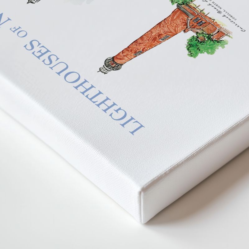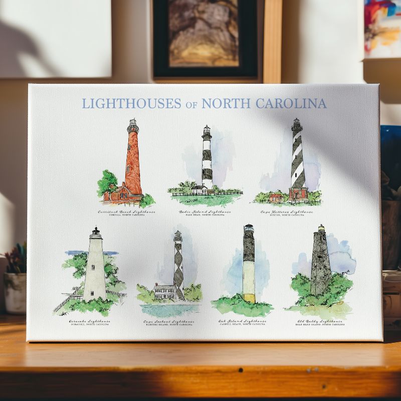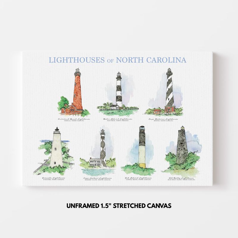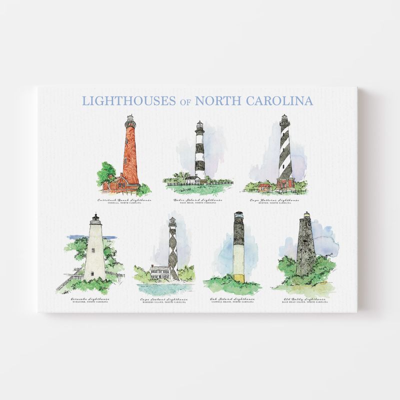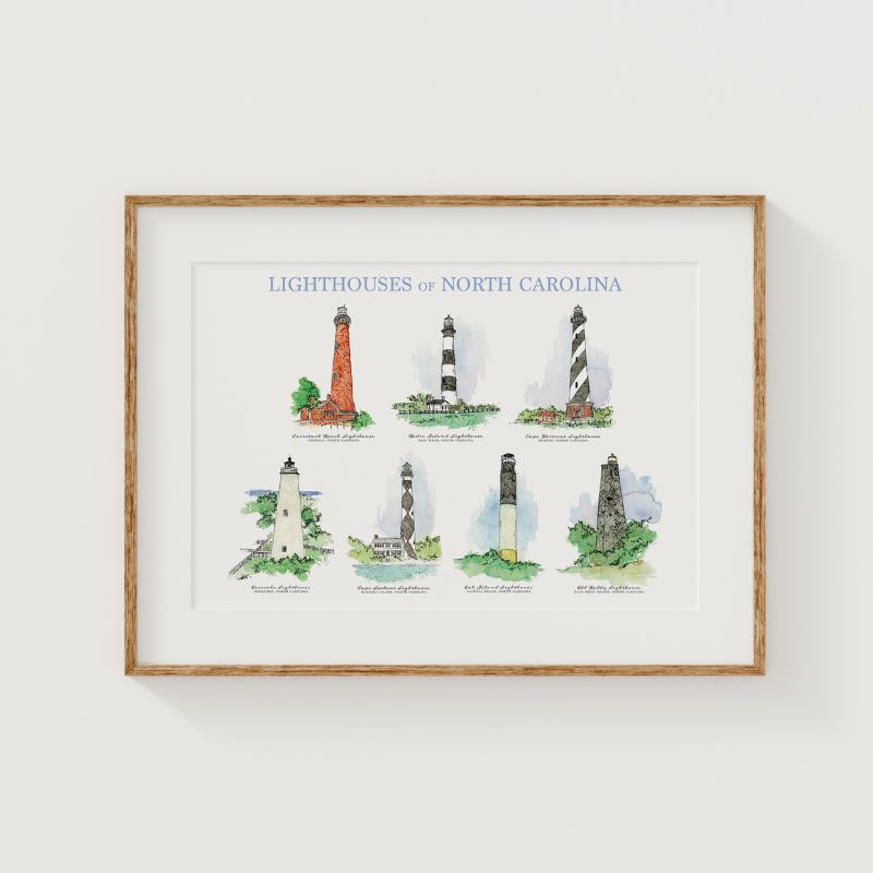 This exclusive piece features seven of North Carolina’s most iconic lighthouses, reimagined in Amanda Klein’s signature soft watercolor and floral style. Beautiful and timeless, this design is perfect for gallery walls, gifts, or anyone who loves the North Carolina Coast.
