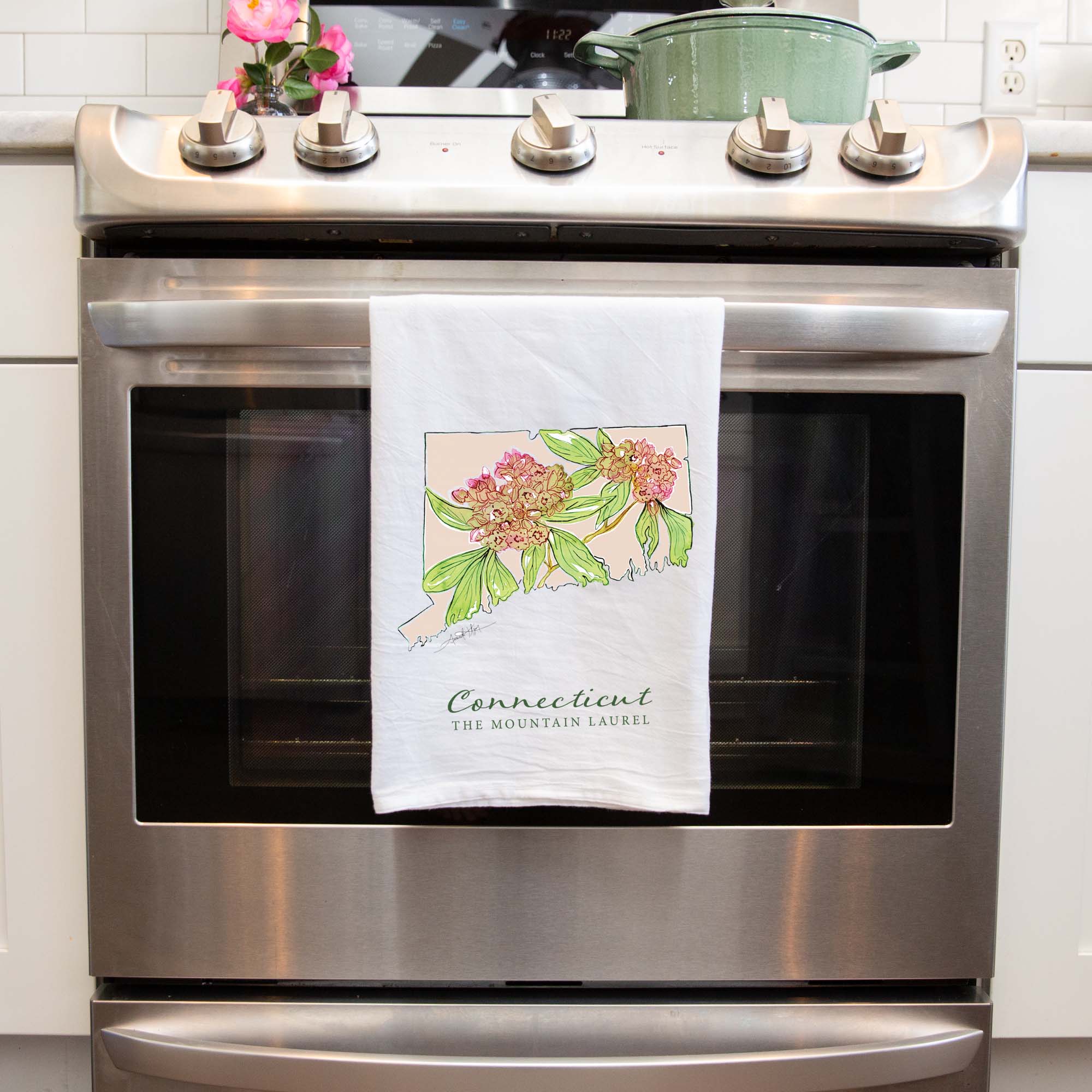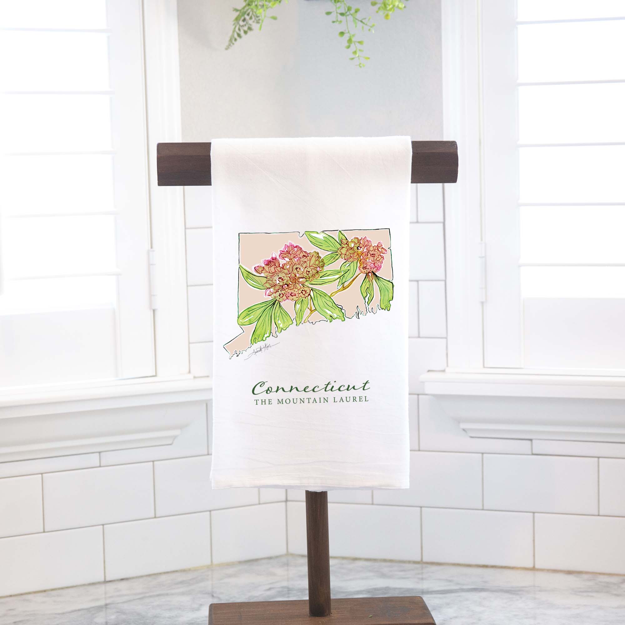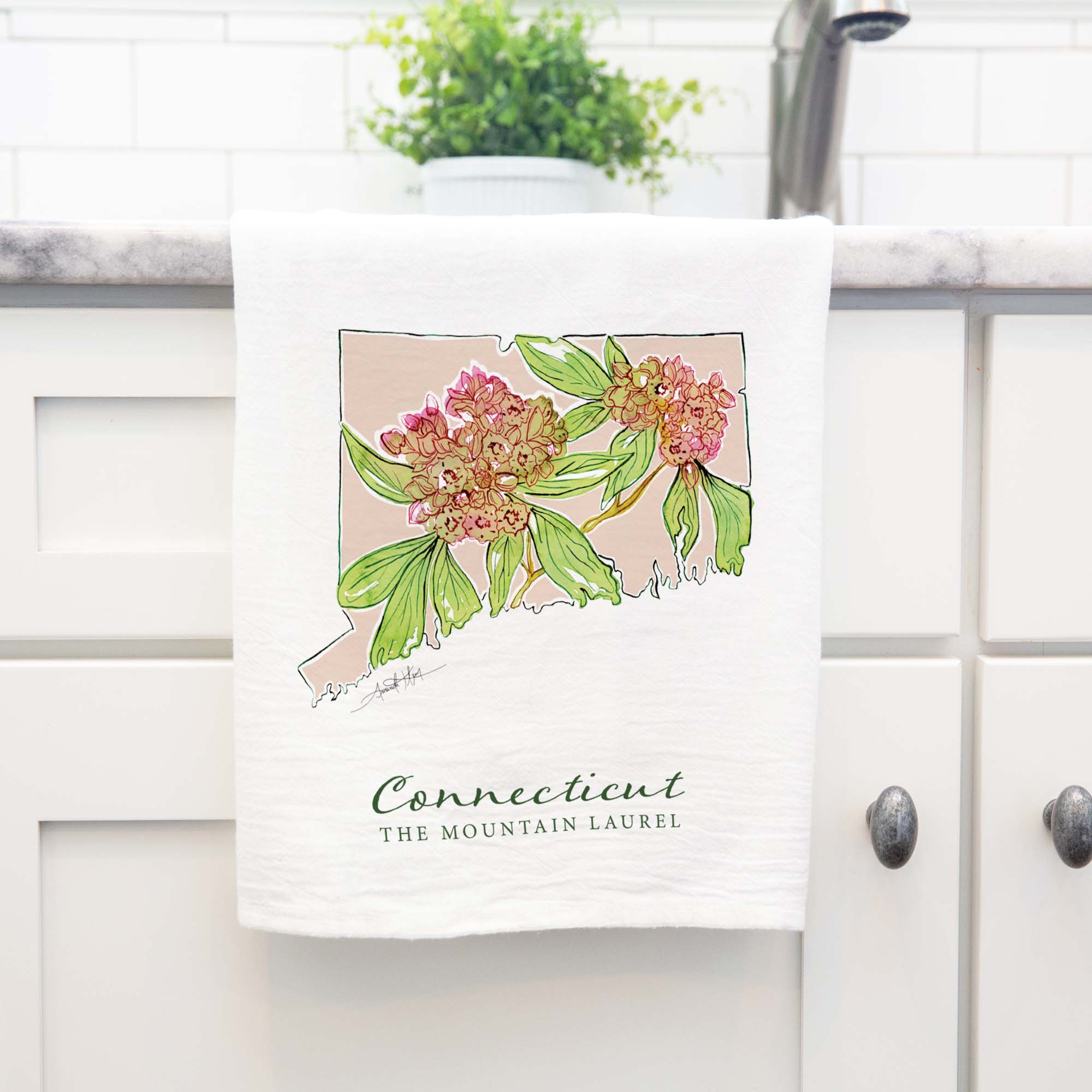 Featuring Connecticut's state flower, the Mountain Laurel, this high quality flour sack tea towel showcases Amanda Klein's whimsical watercolor and splattered design. A uniquely perfect gift for any hostess, bride, teacher, friend, or well-traveled loved one.