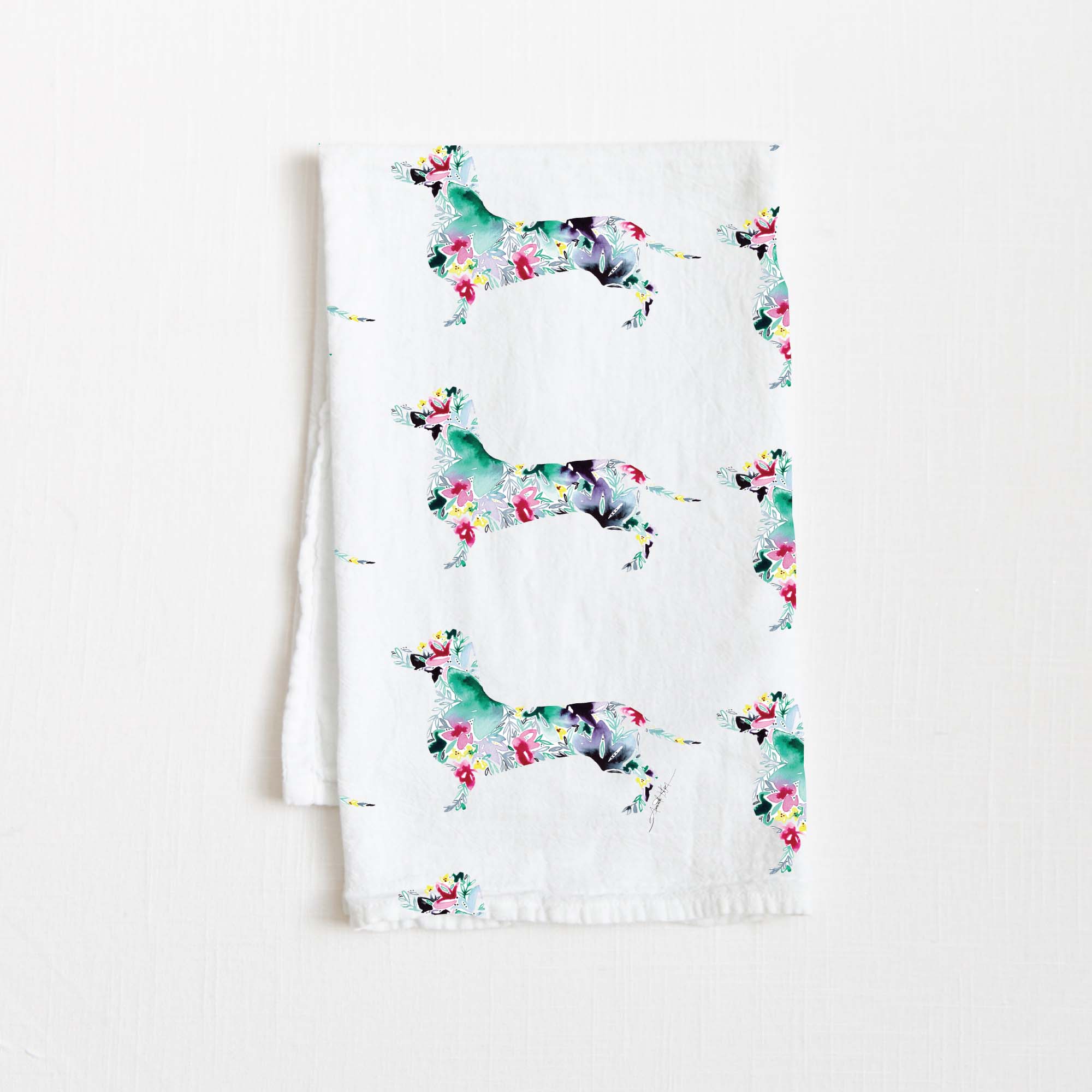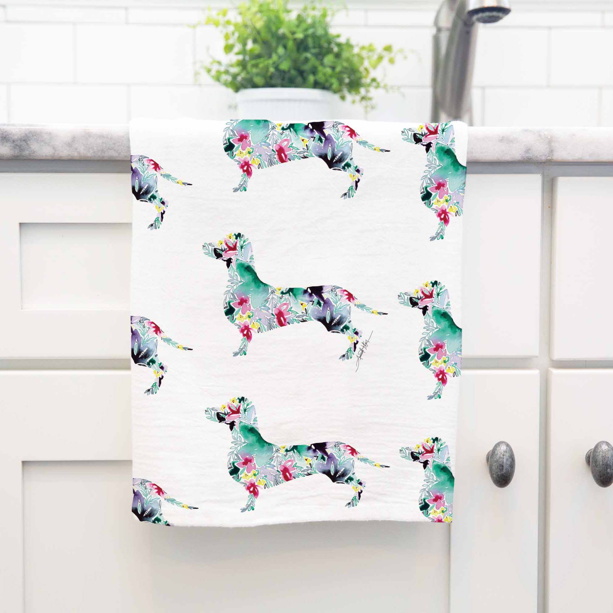 This high quality Dachshund flour sack tea towel showcases Amanda Klein's whimsical watercolor and splattered design. A uniquely perfect gift for any hostess, bride, teacher, friend, or loved one.