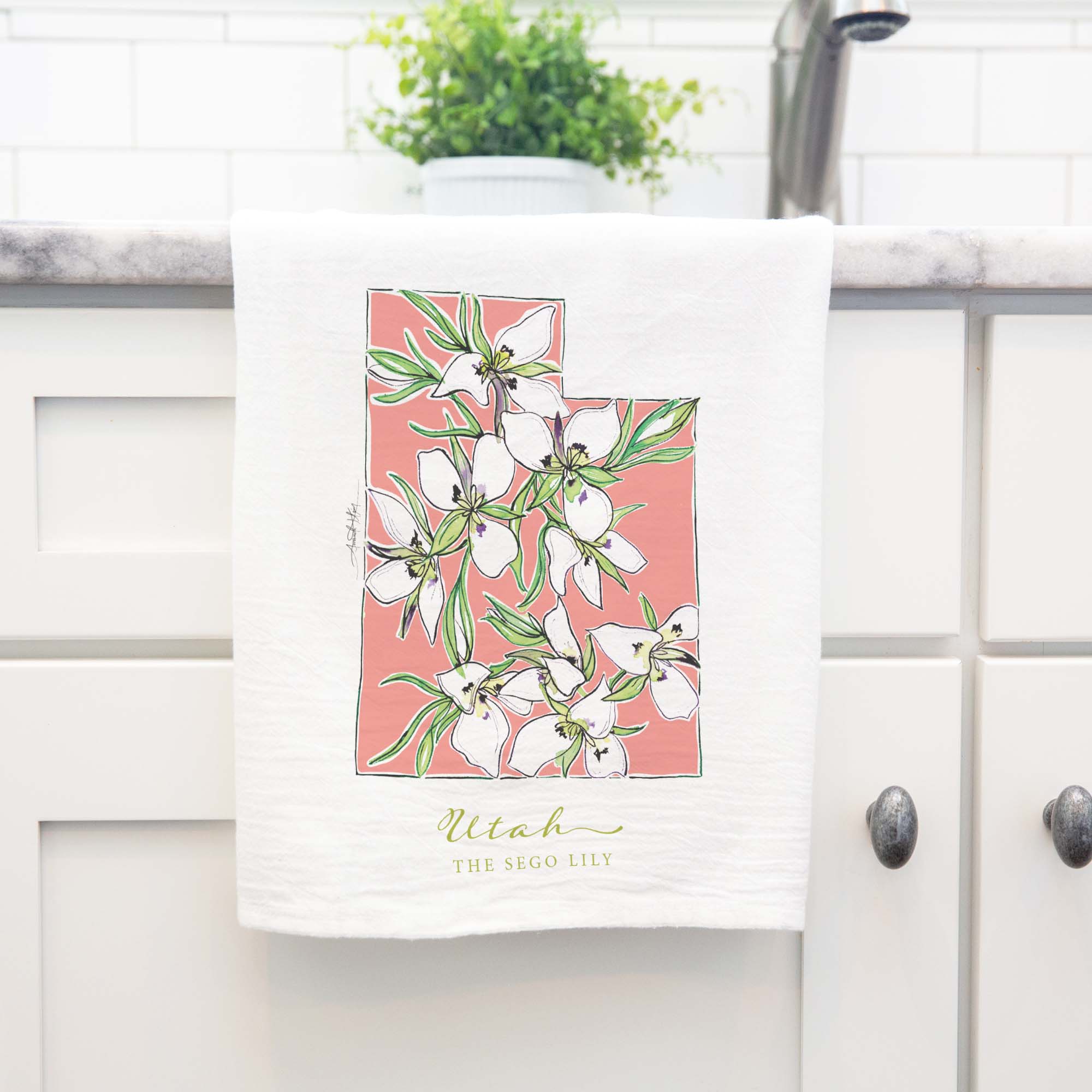Featuring Utah's state flower, the Sego Lily, this high quality flour sack tea towel showcases Amanda Klein's whimsical watercolor and splattered design. A uniquely perfect gift for any hostess, bride, teacher, friend, or well-traveled loved one.