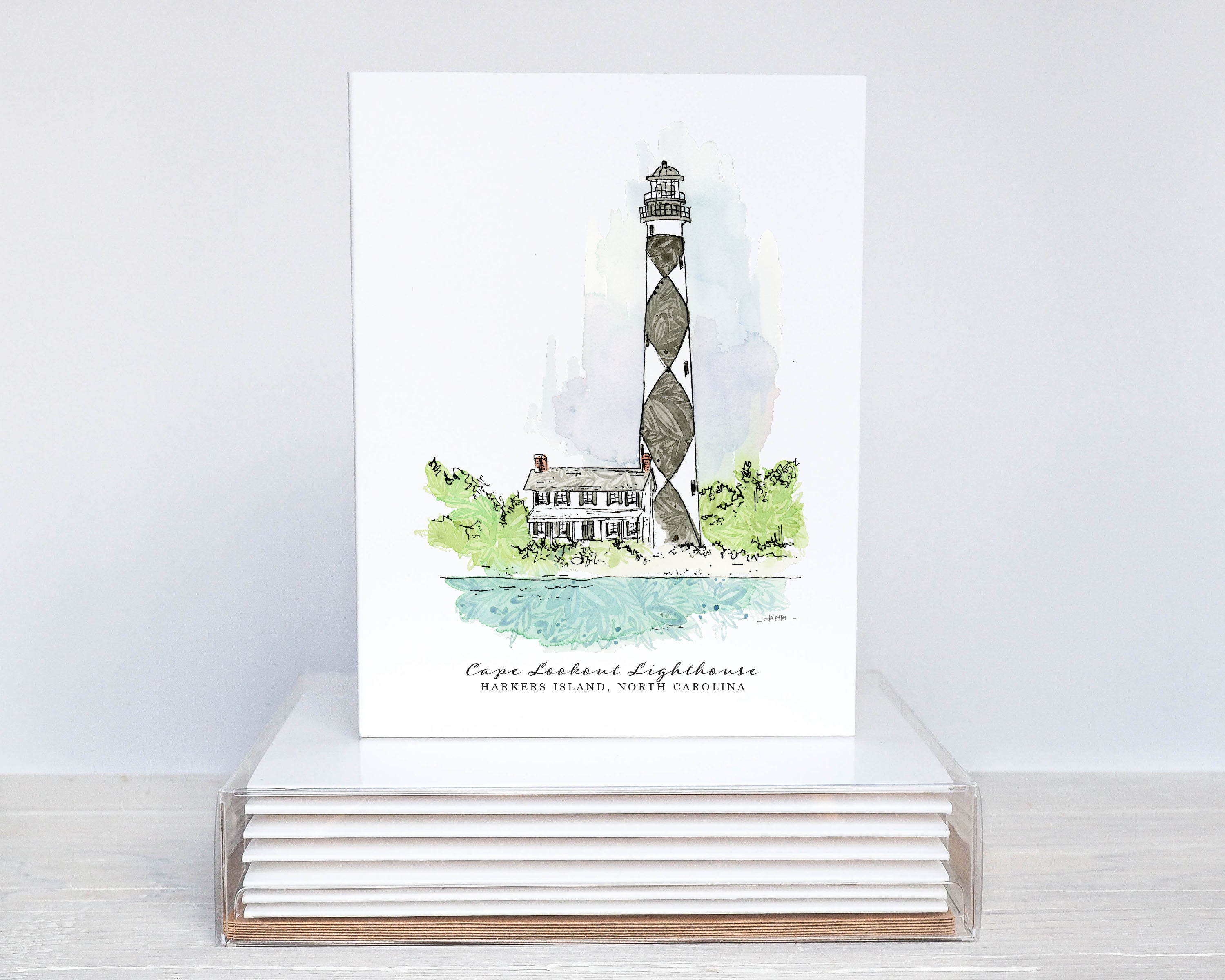 Bring a touch of the North Carolina coast to your correspondence with this charming notecard set featuring the iconic Cape Lookout Lighthouse. Rendered in Amanda Klein’s signature watercolor and acrylic ink style, these cards showcase the lighthouse’s distinctive black-and-white diamond pattern and serene coastal setting. These coastal lighthouse notecards make a lovely gift for friends, teachers, neighbors, or anyone who loves the North Carolina shore—and they’re perfect to keep on hand for everyday correspondence.