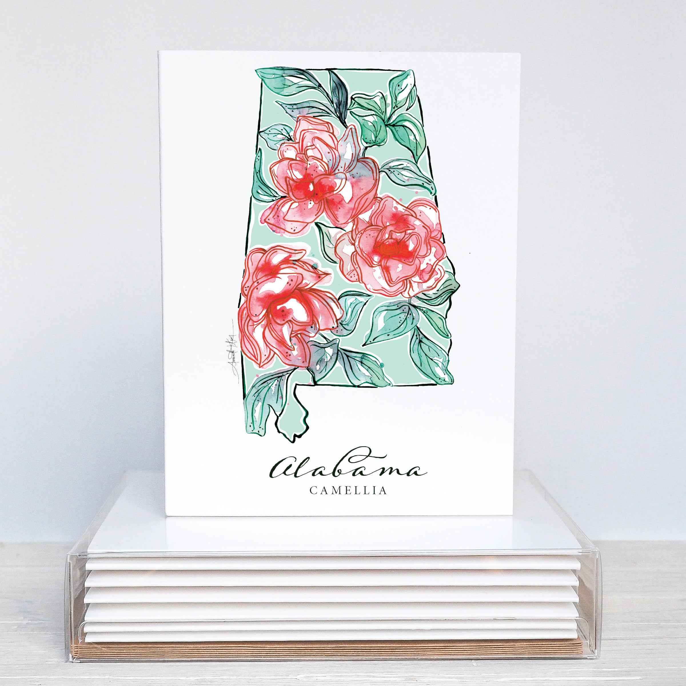 Sweet Home Alabama. Our Alabama collection is hand-designed and hand-packaged and ships from our Alabama studio! The Alabama print, stickers and notecards features flowers found growing throughout the state. Our flour sack towel, notepads and pillow cover feature the Alabama state flower, the Camilla.