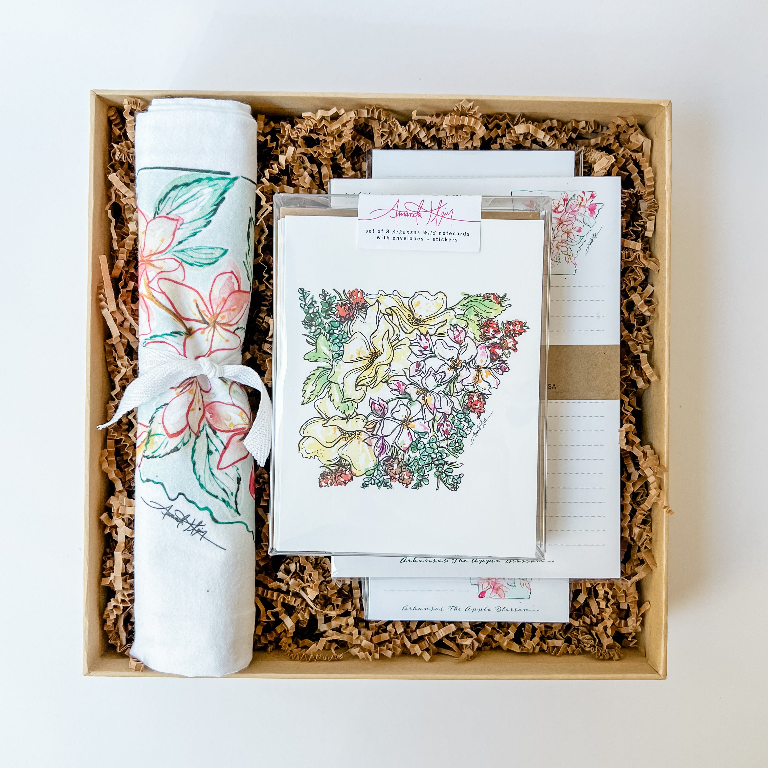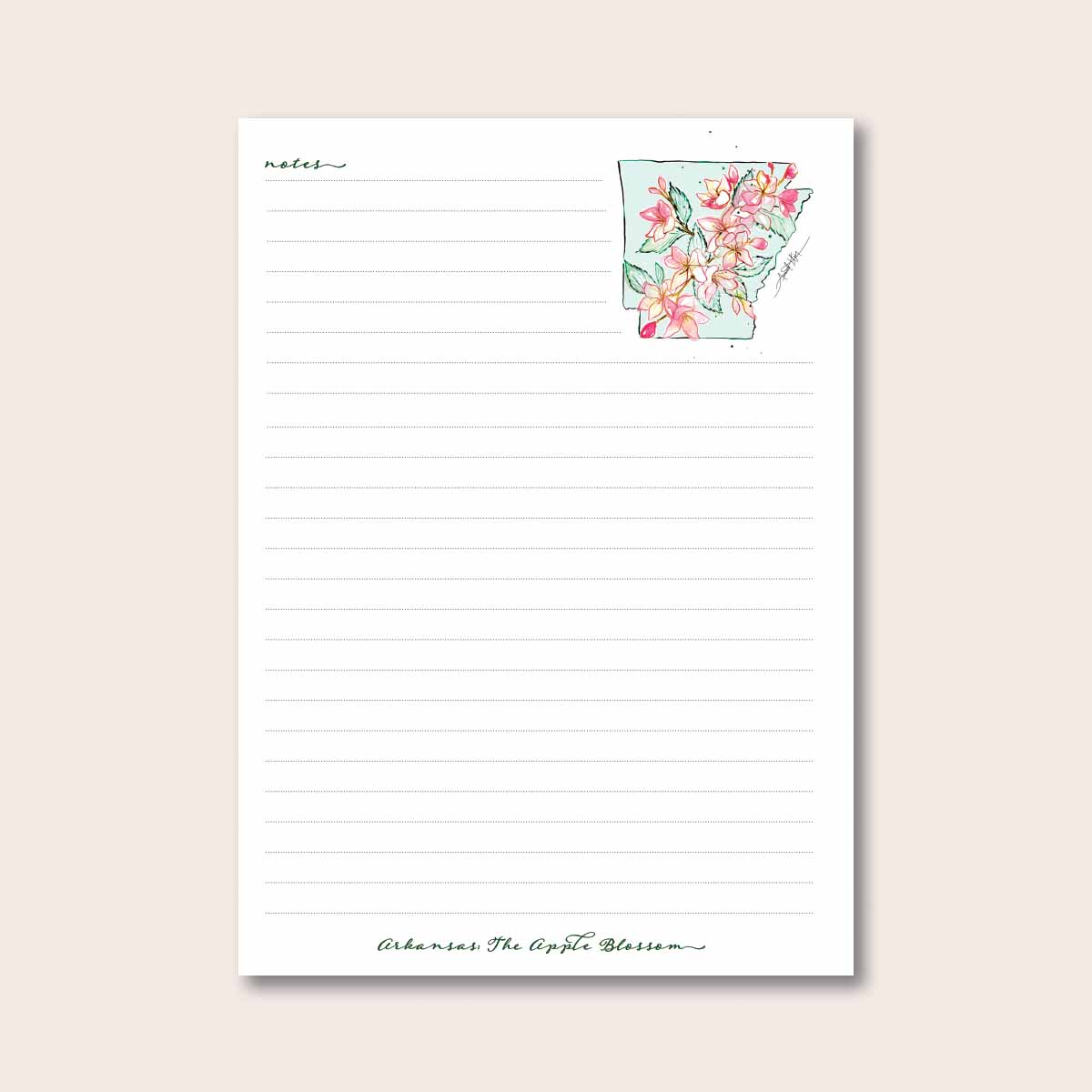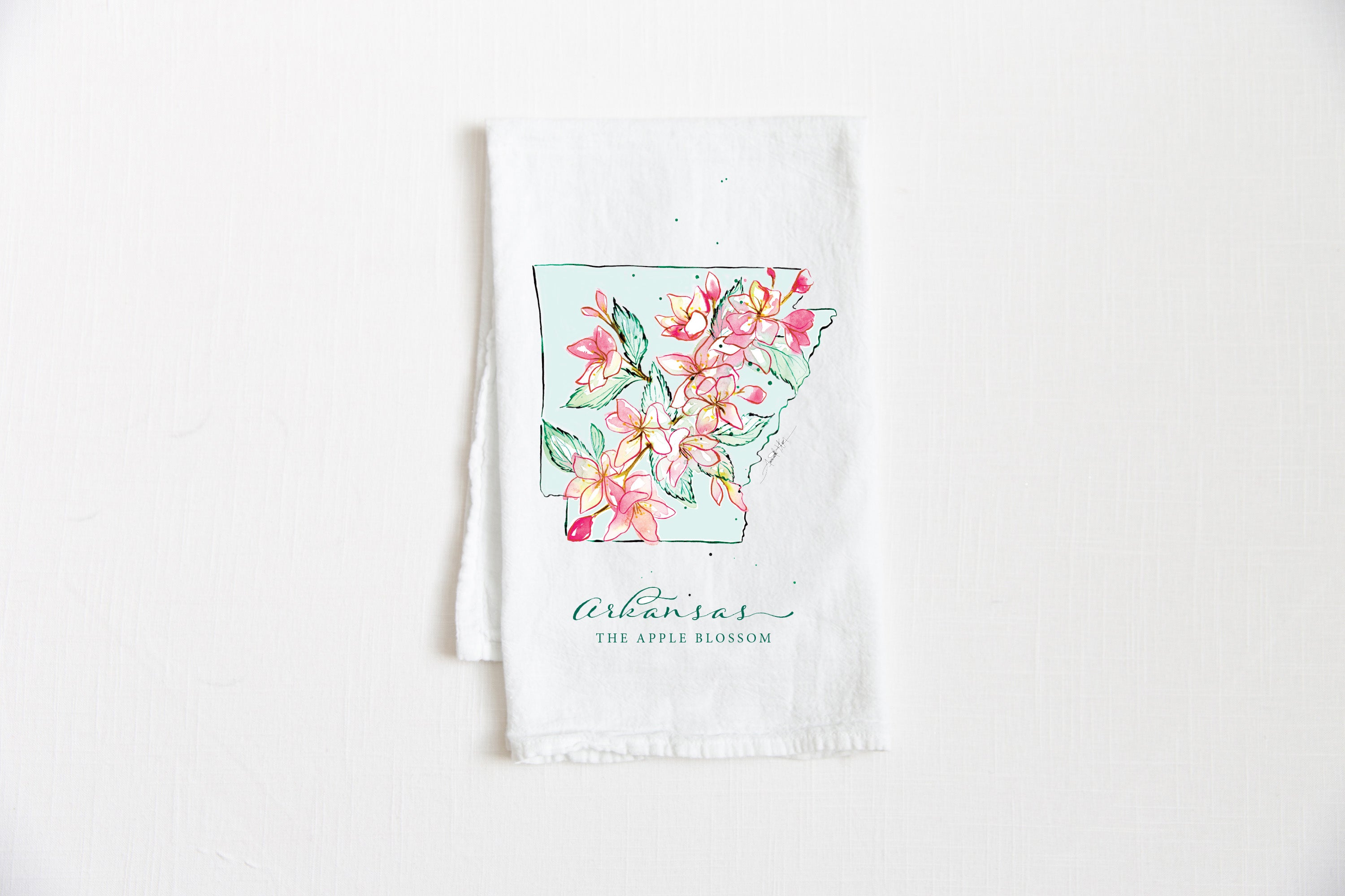 ✨ Flour Sack Towel, Desk Notepad, and Refrigerator Notepad all feature the Arkansas State Flower, the Apple Blossom.