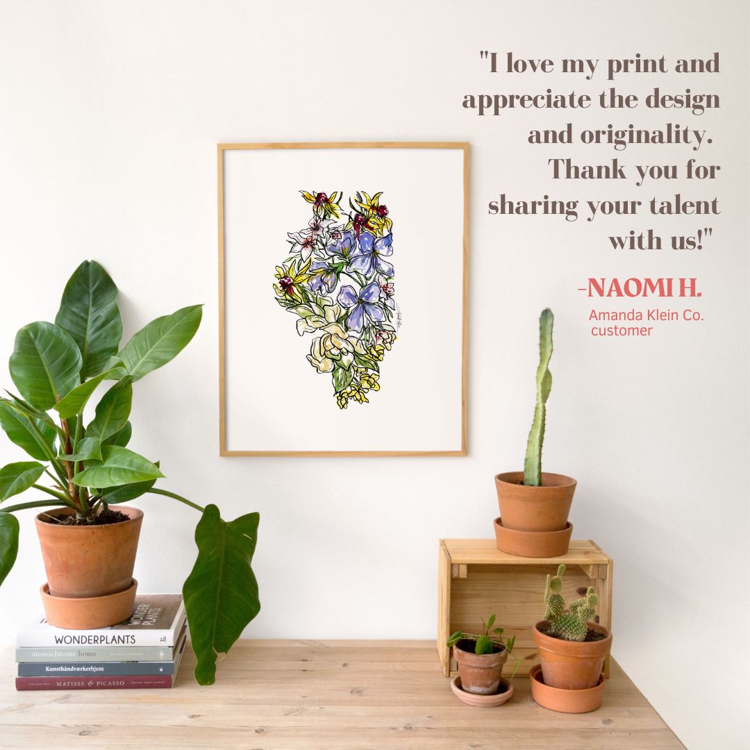 Featuring wildflowers specific to each individual state, these high quality fine art reproductions of Amanda Klein’s original artwork beautifully showcase her whimsical watercolor designs.  A uniquely perfect gift for any hostess, bride, holiday, teacher, friend or well traveled loved one.