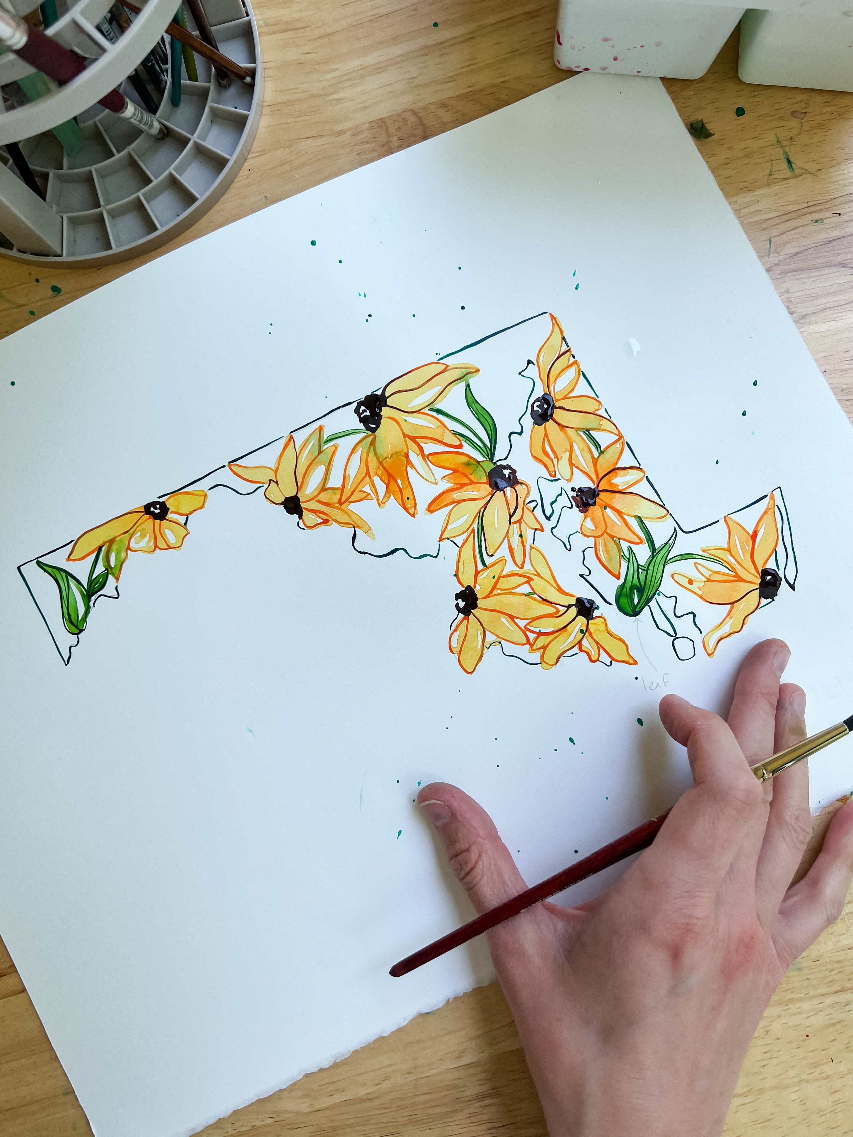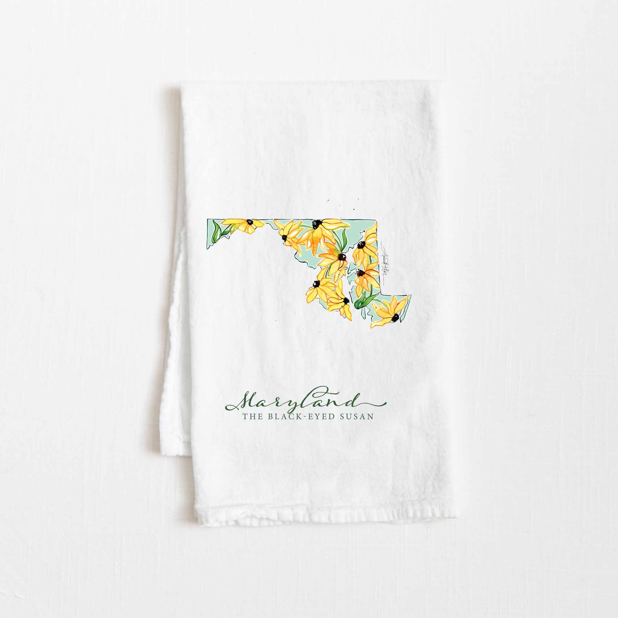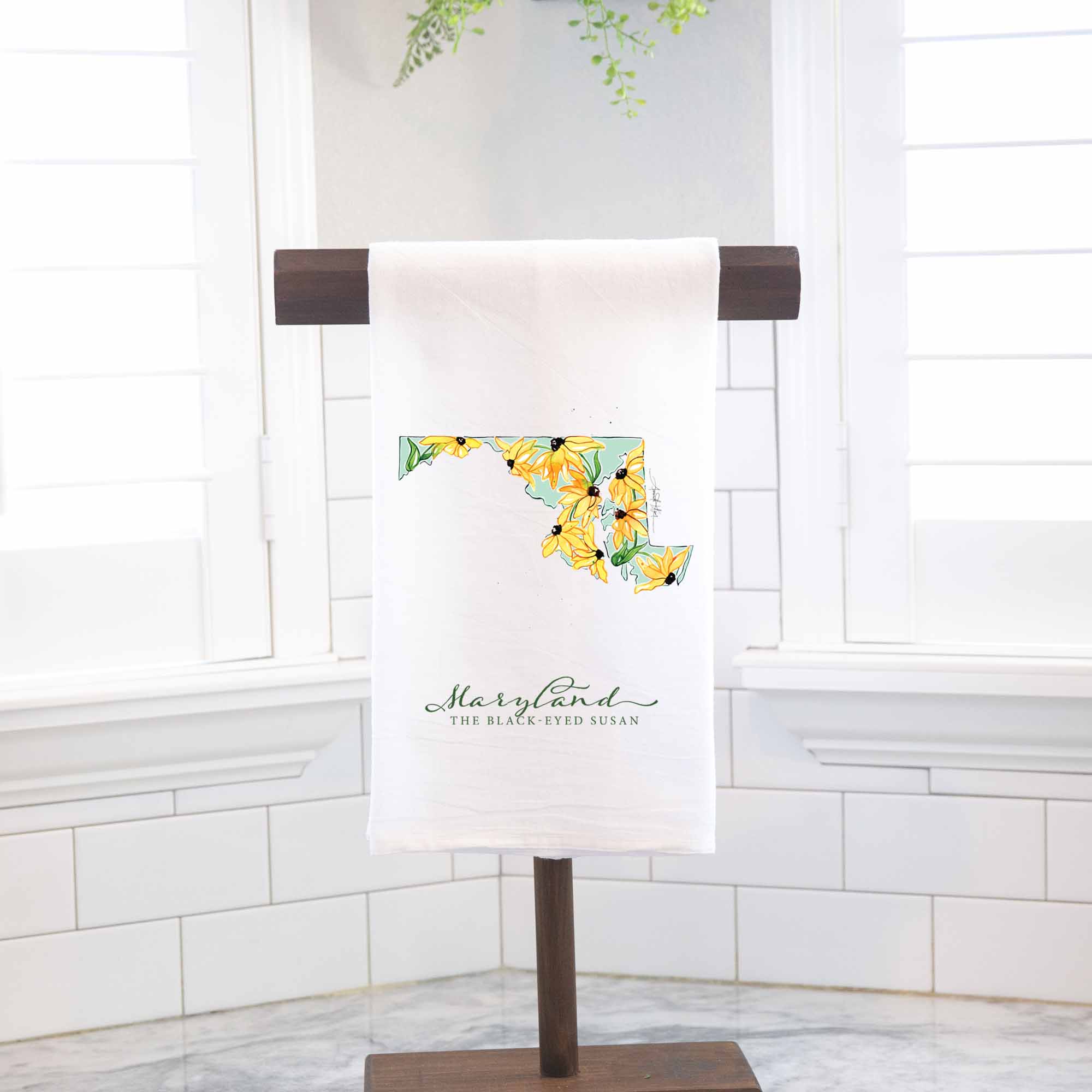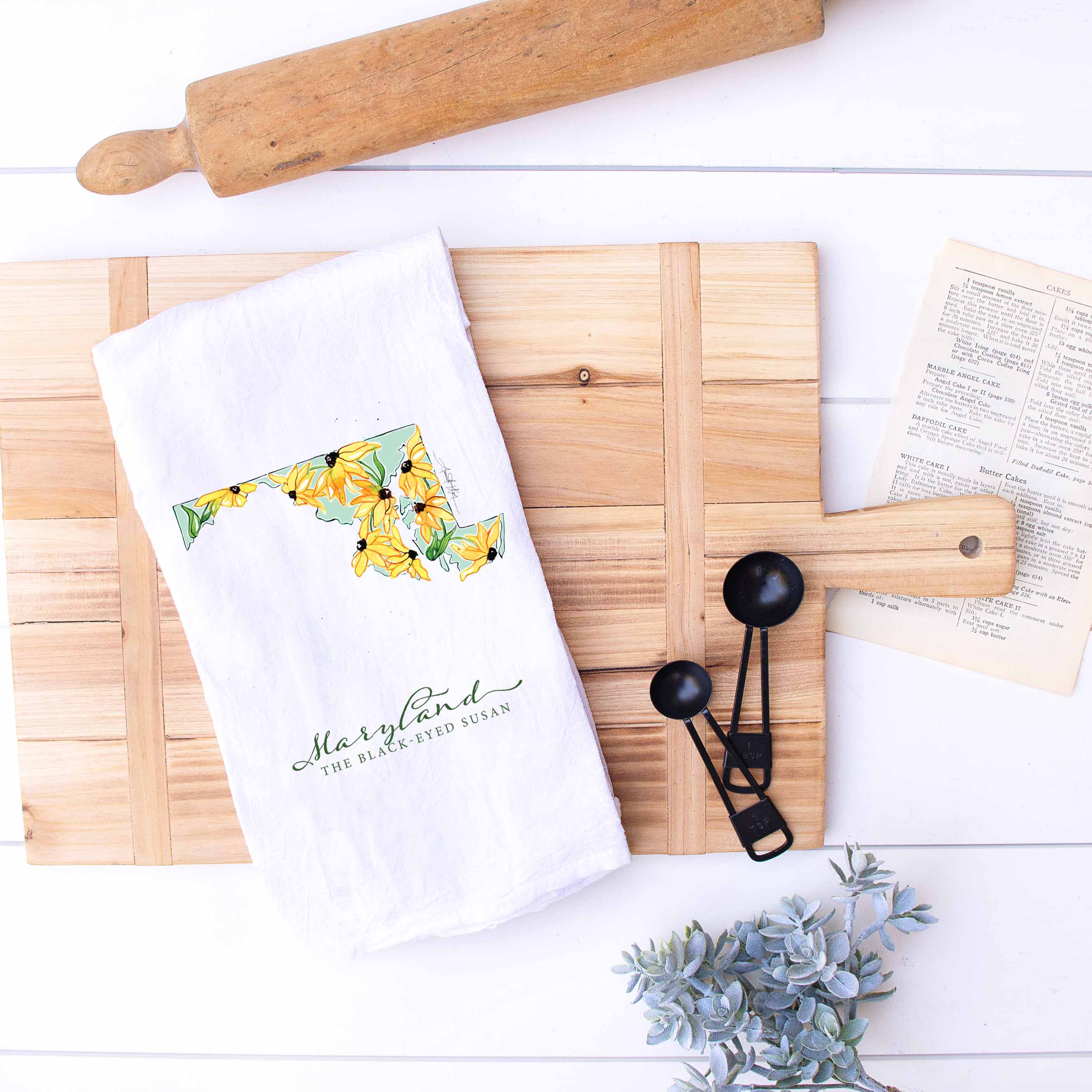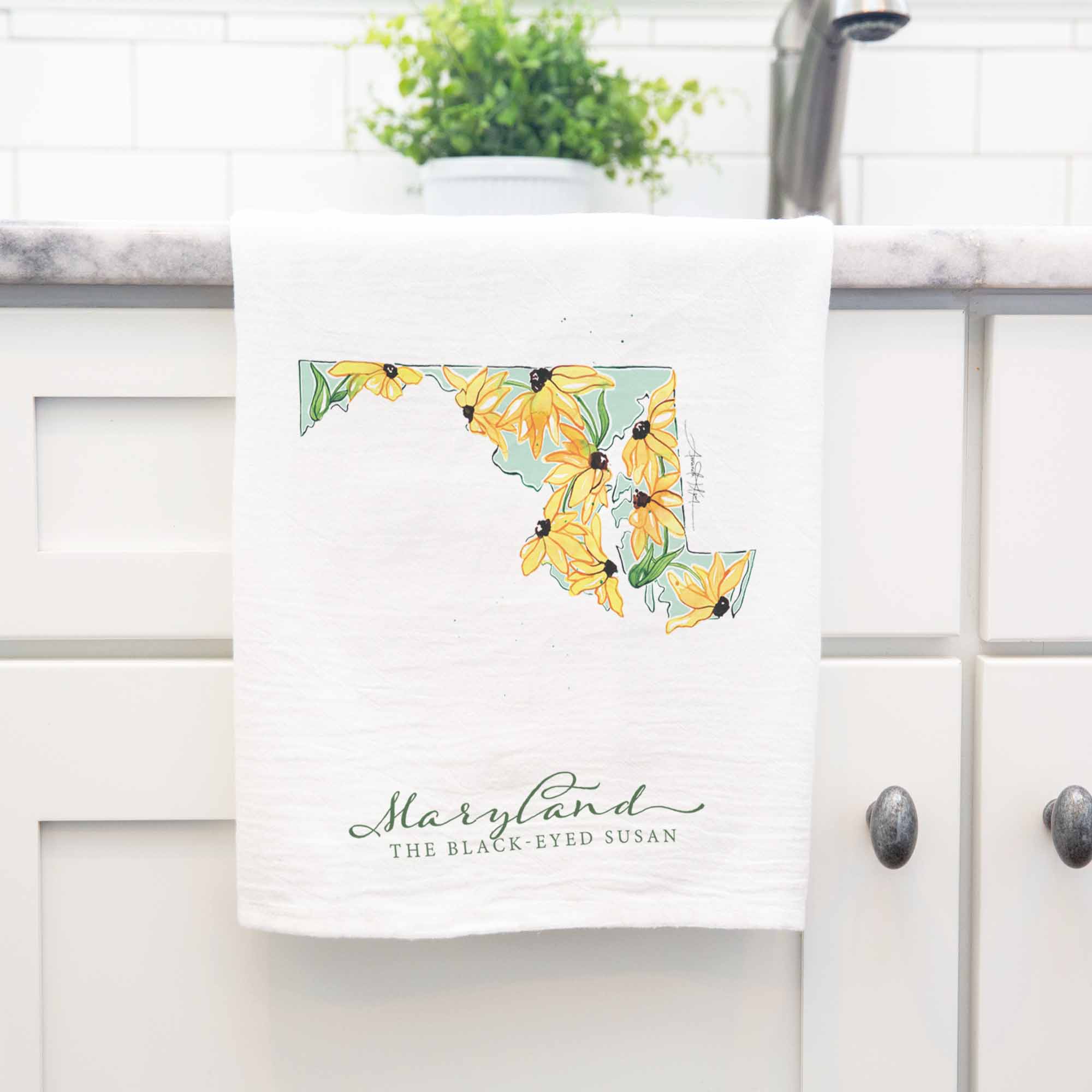 Featuring Maryland's state flower, the Black-eyed Susan, this high quality flour sack tea towel showcases Amanda Klein's whimsical watercolor and splattered design. A uniquely perfect gift for any hostess, bride, teacher, friend, or well-traveled loved one.