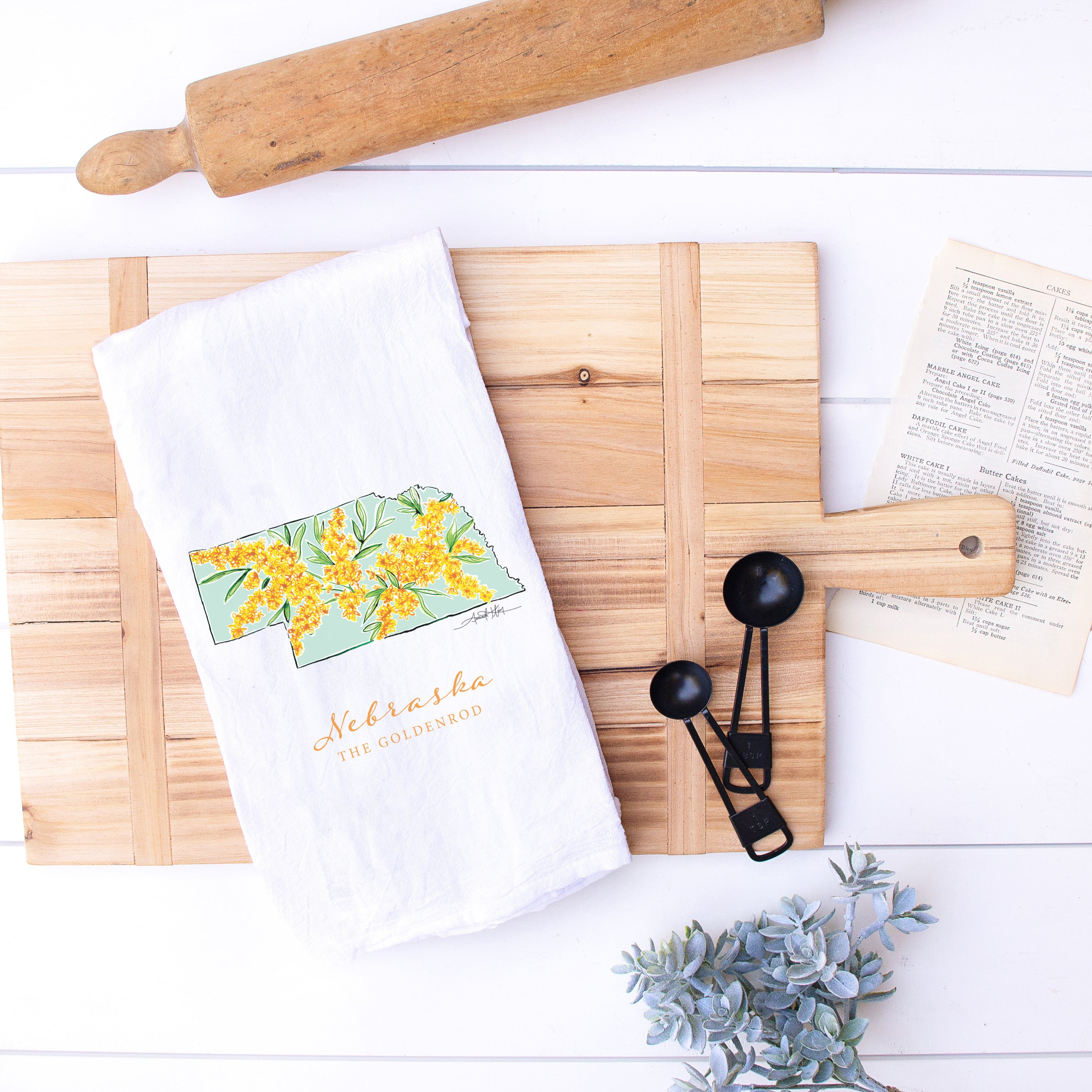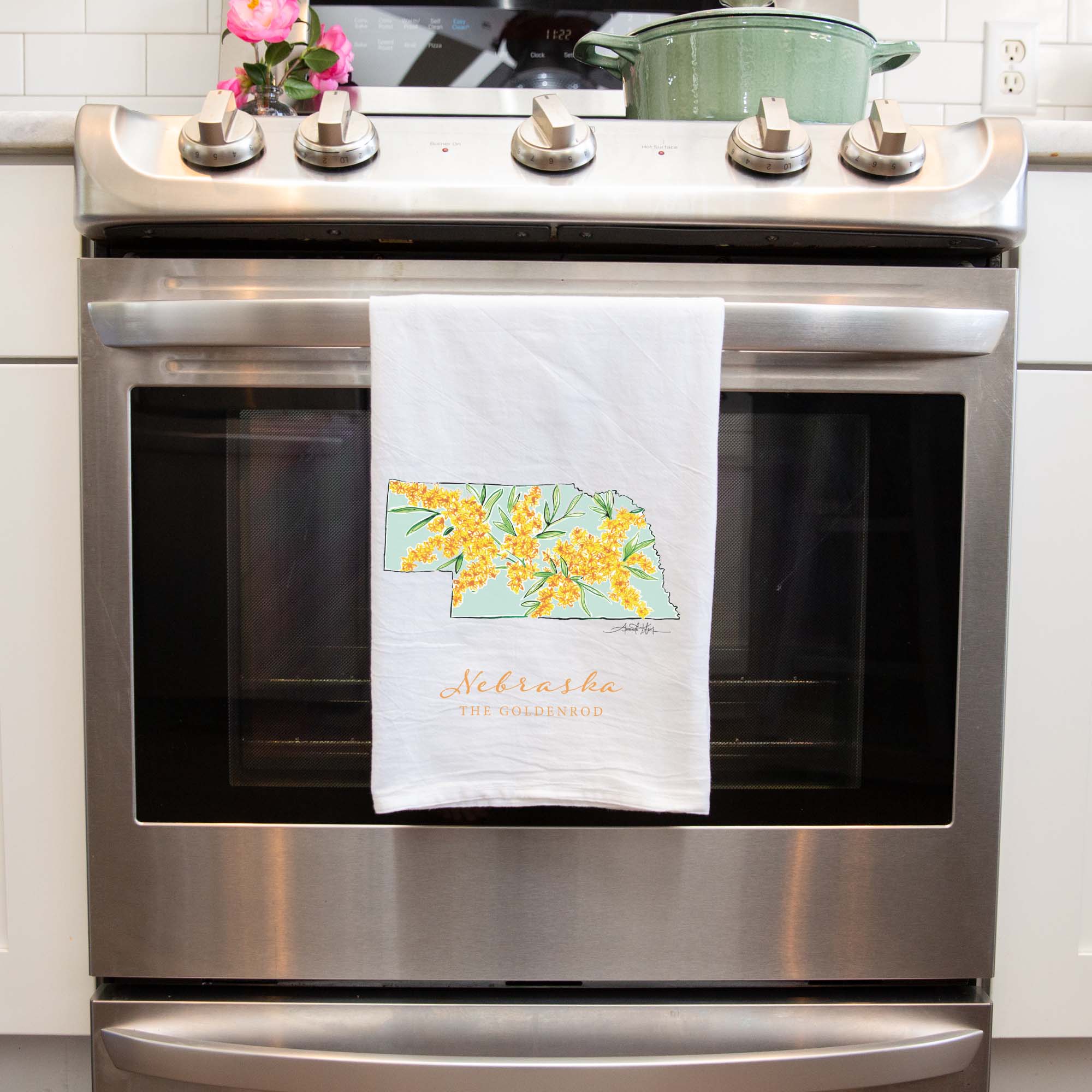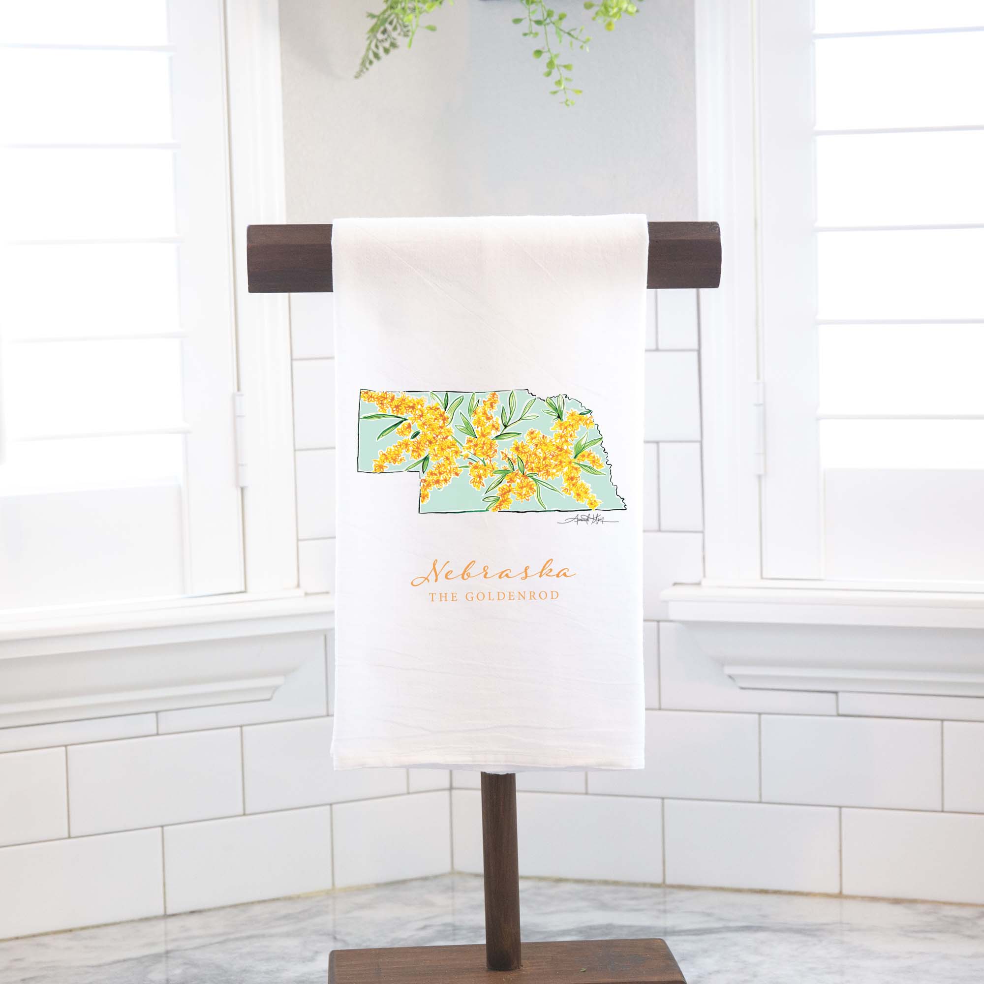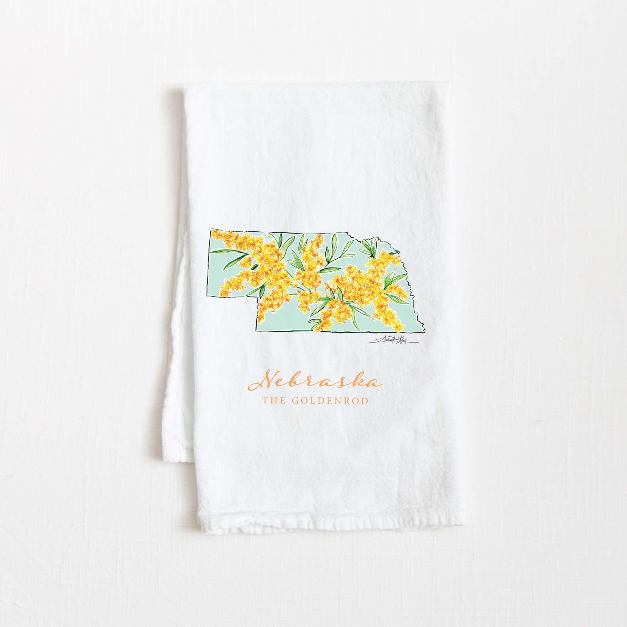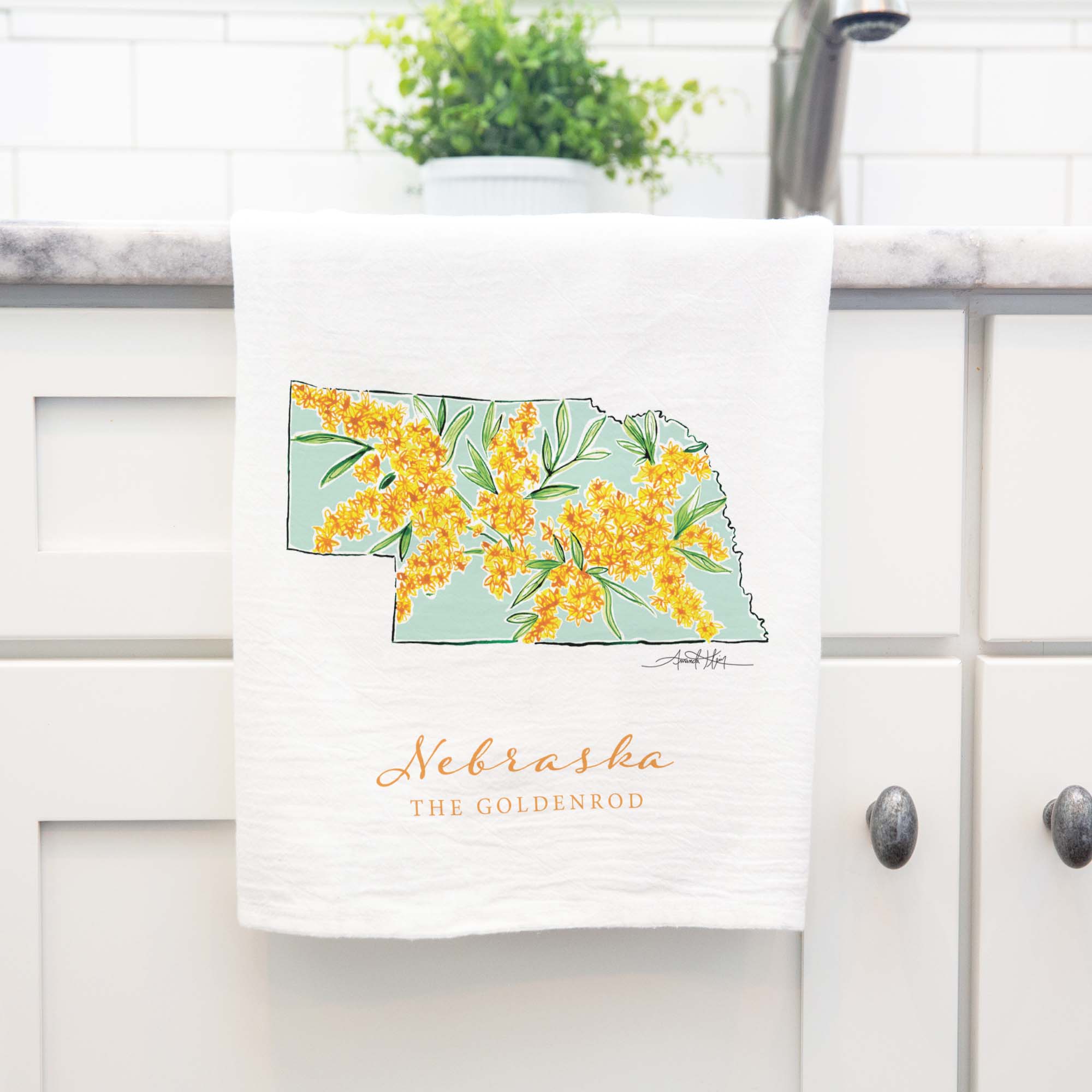 Featuring Nebraska's state flower, the Goldenrod, this high quality flour sack tea towel showcases Amanda Klein's whimsical watercolor and splattered design. A uniquely perfect gift for any hostess, bride, teacher, friend, or well-traveled loved one.