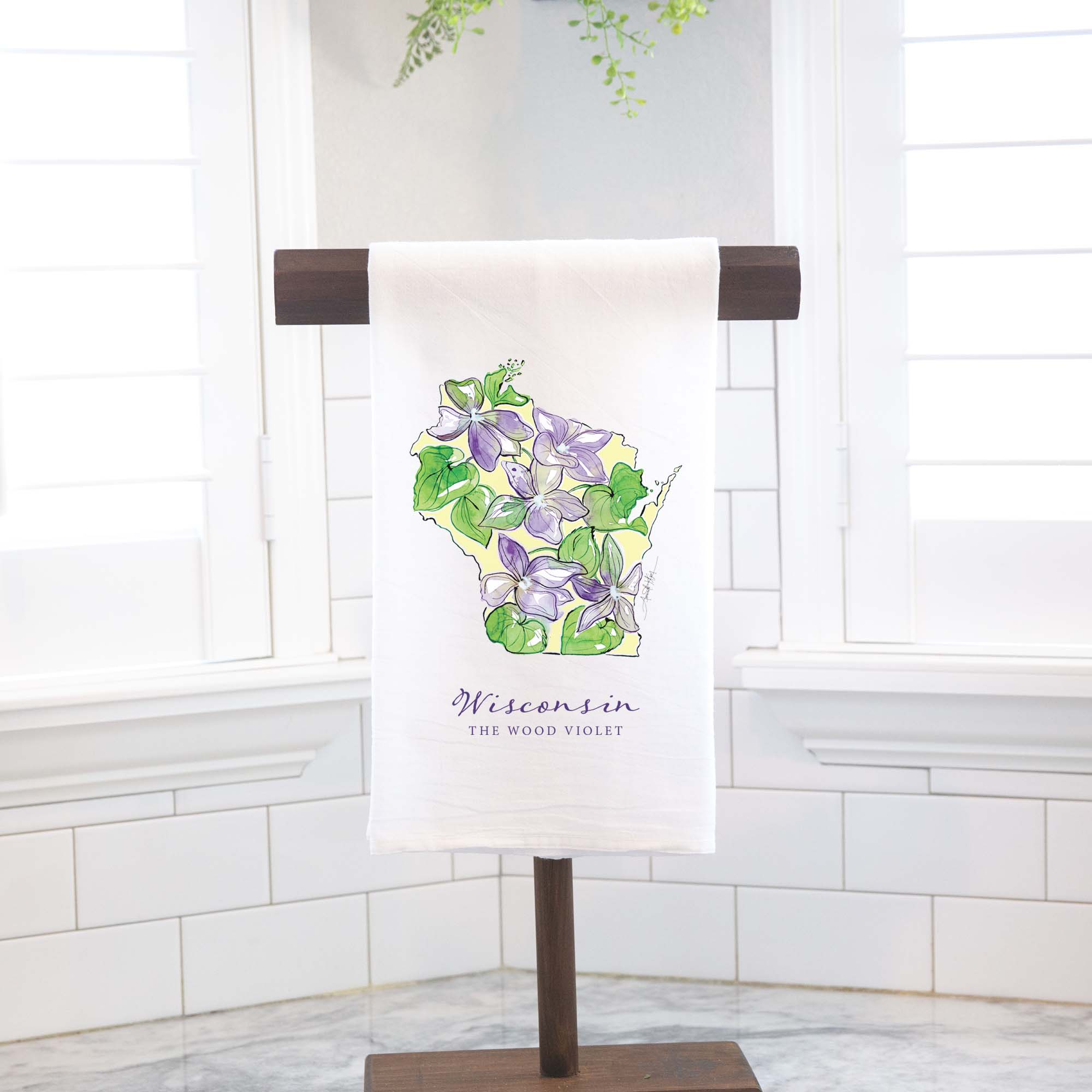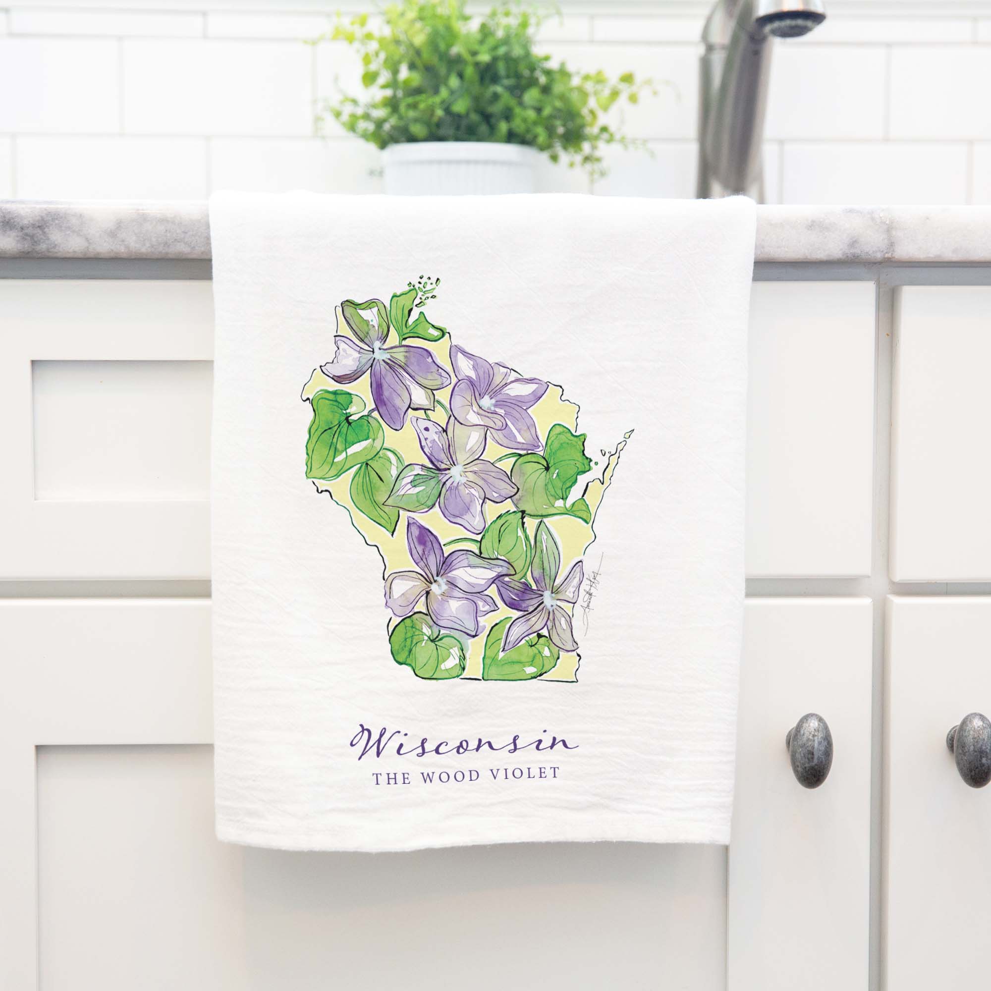 Featuring Wisconsin's state flower, the Wood Violet, this high quality flour sack tea towel showcases Amanda Klein's whimsical watercolor and splattered design. A uniquely perfect gift for any hostess, bride, teacher, friend, or well-traveled loved one.
