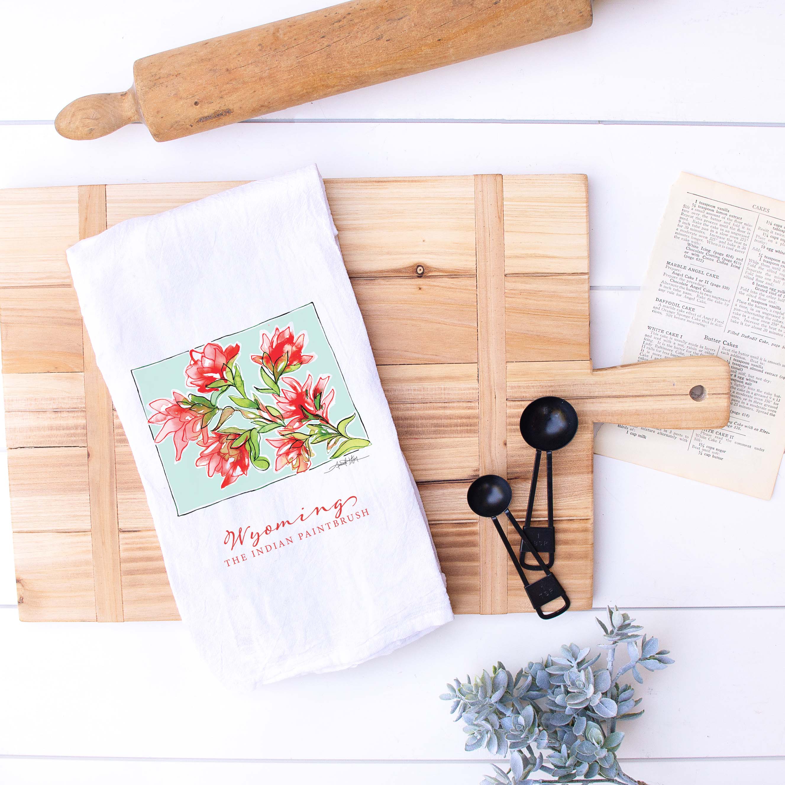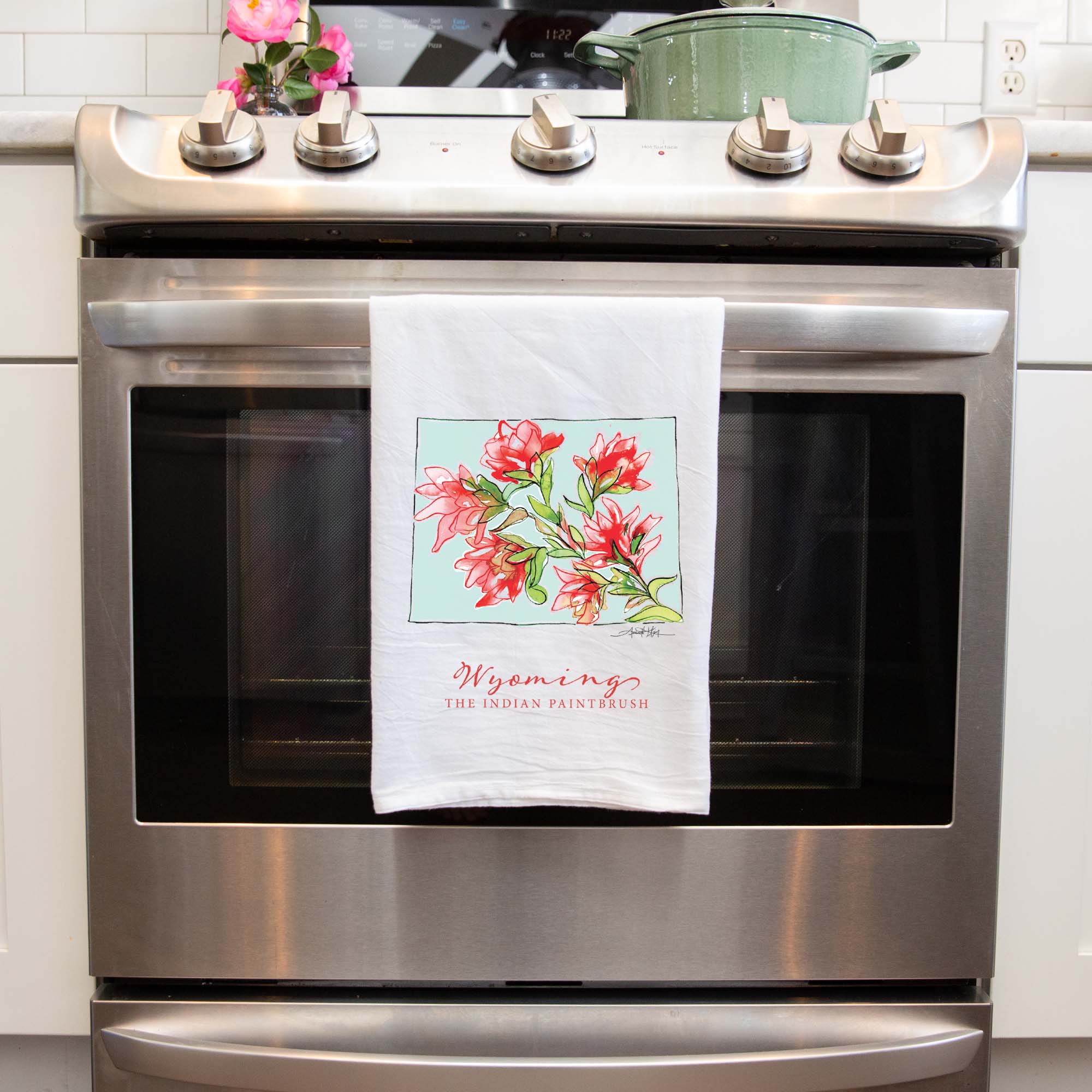 Featuring Wyoming's state flower, the Indian Paintbrush, this high quality flour sack tea towel showcases Amanda Klein's whimsical watercolor and splattered design. A uniquely perfect gift for any hostess, bride, teacher, friend, or well-traveled loved one.