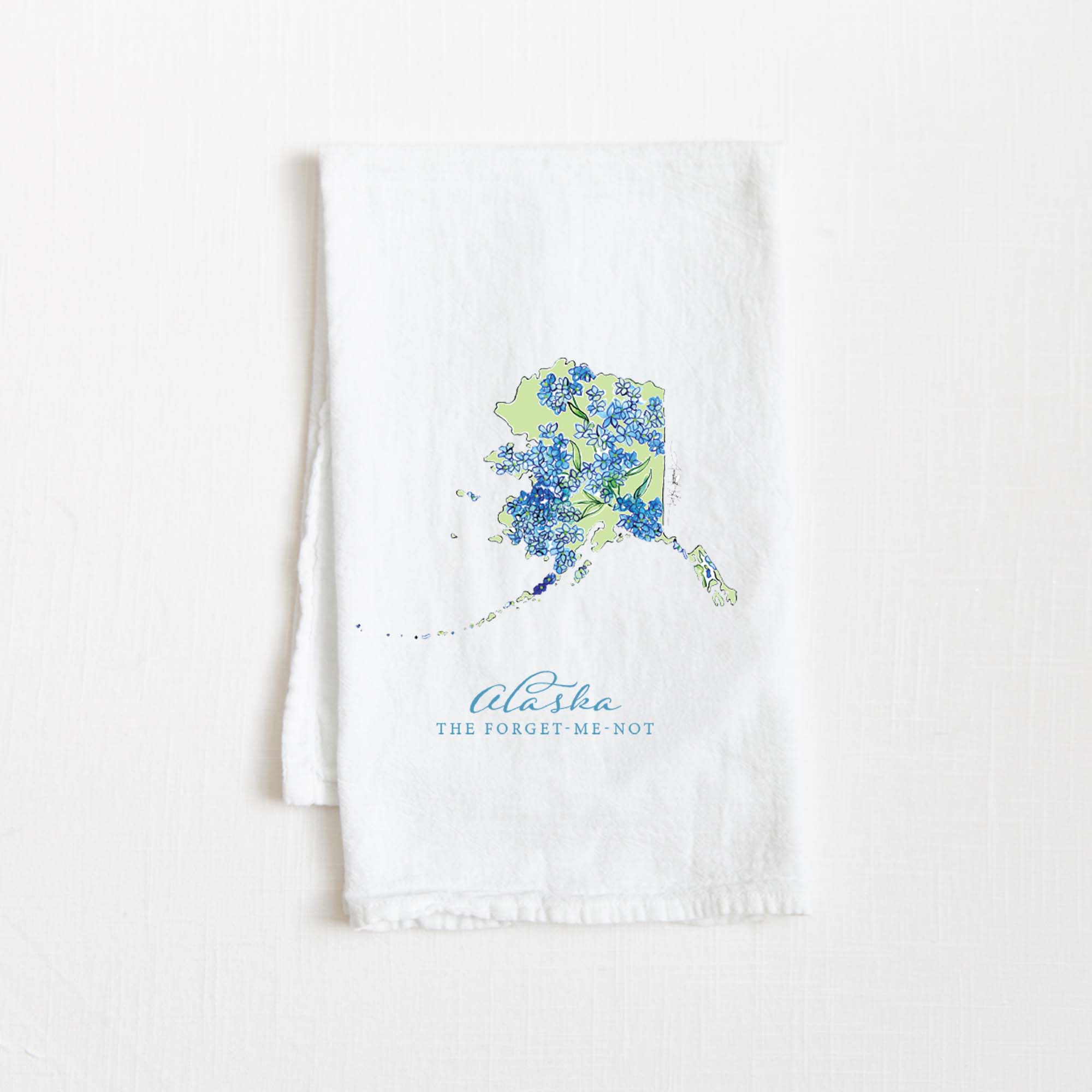 ✨ Flour Sack Towel, Desk Notepad, and Refrigerator Notepad all feature the Alaska State Flower, the Forget-Me-Not.