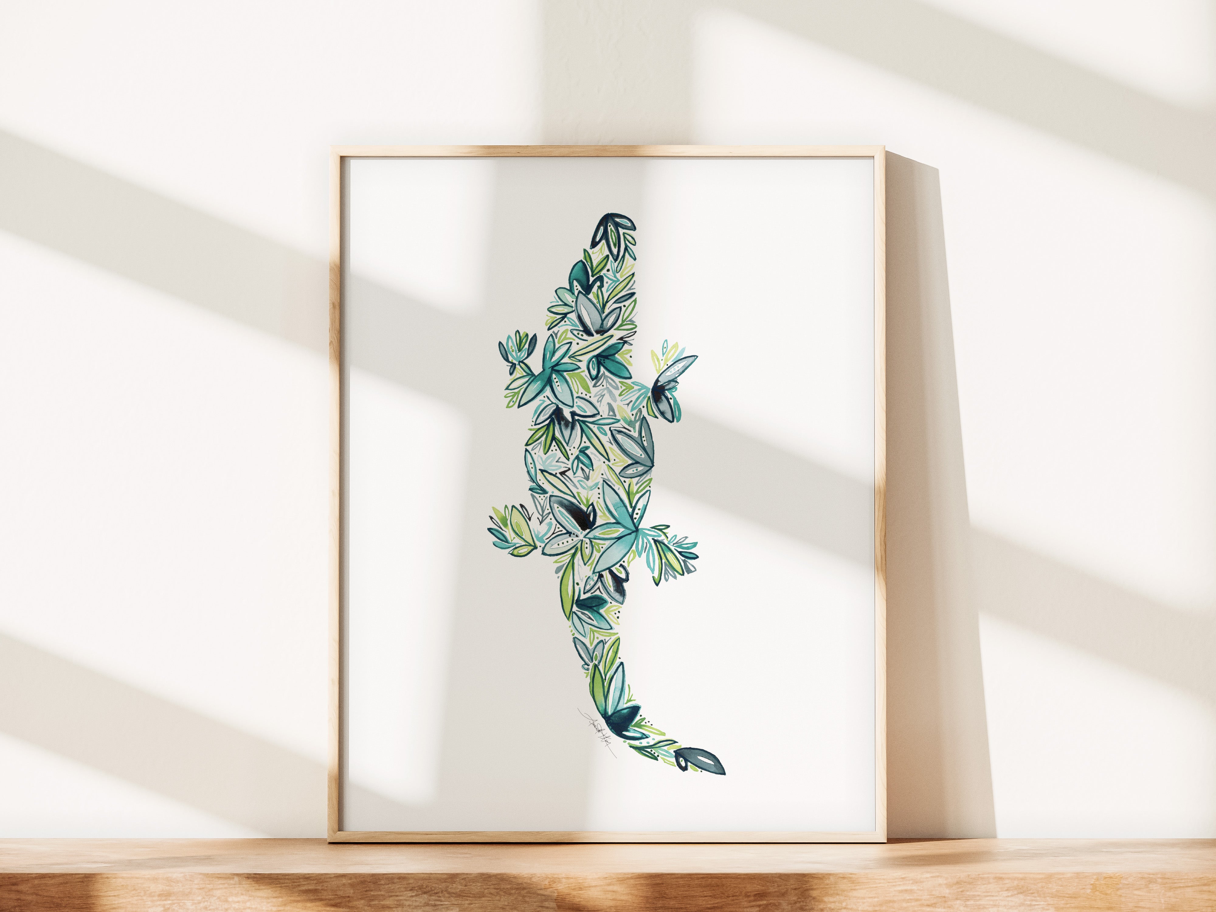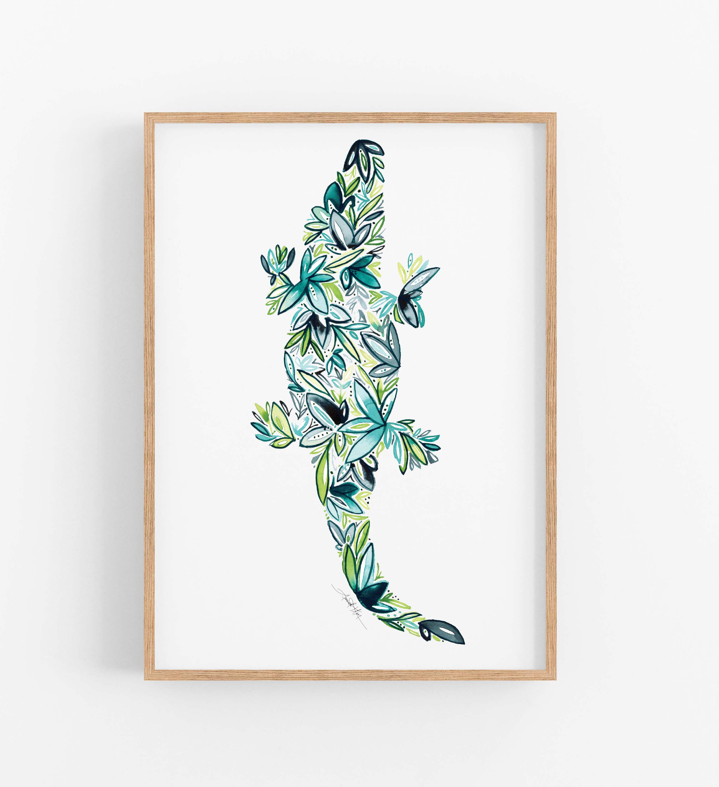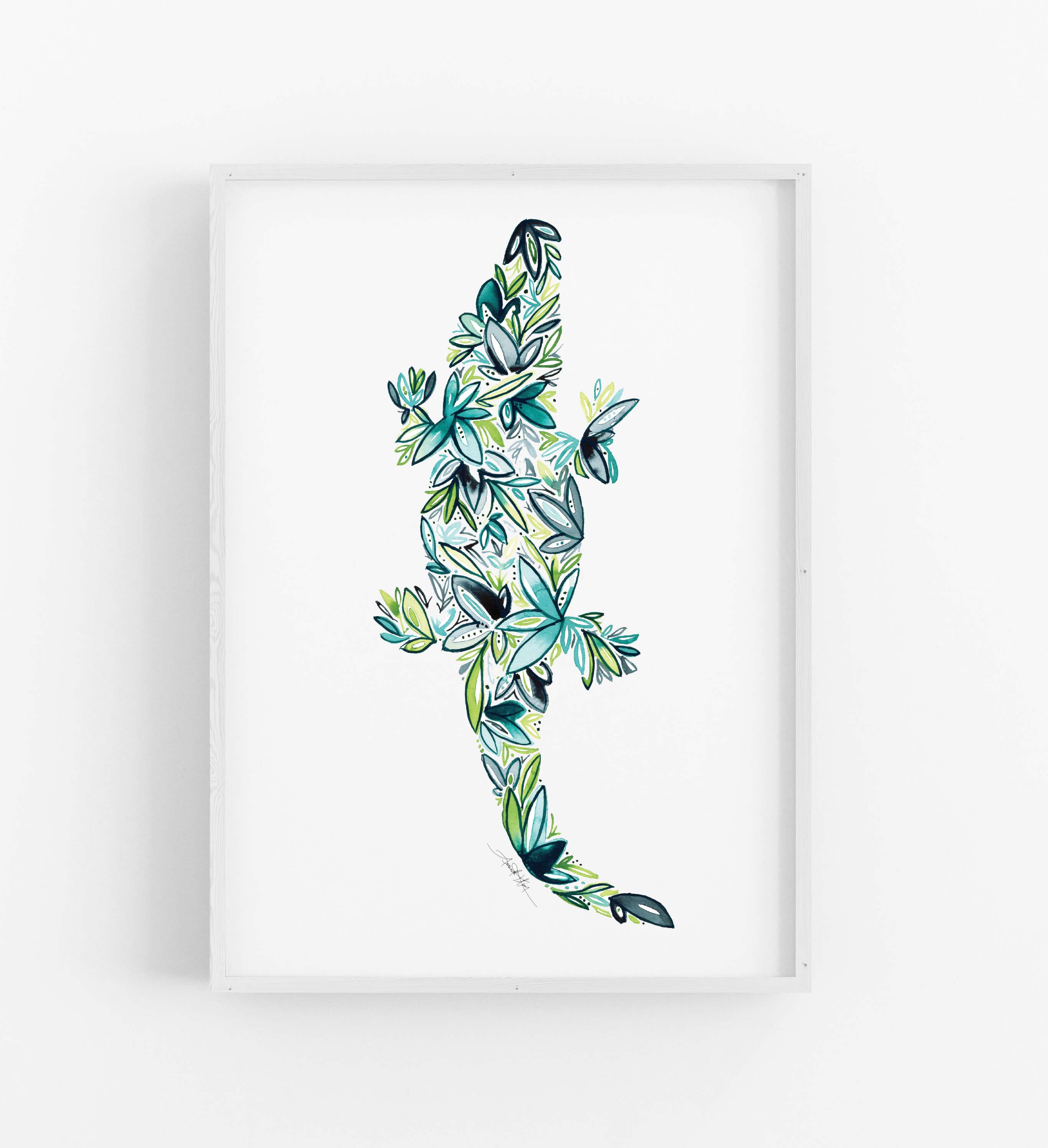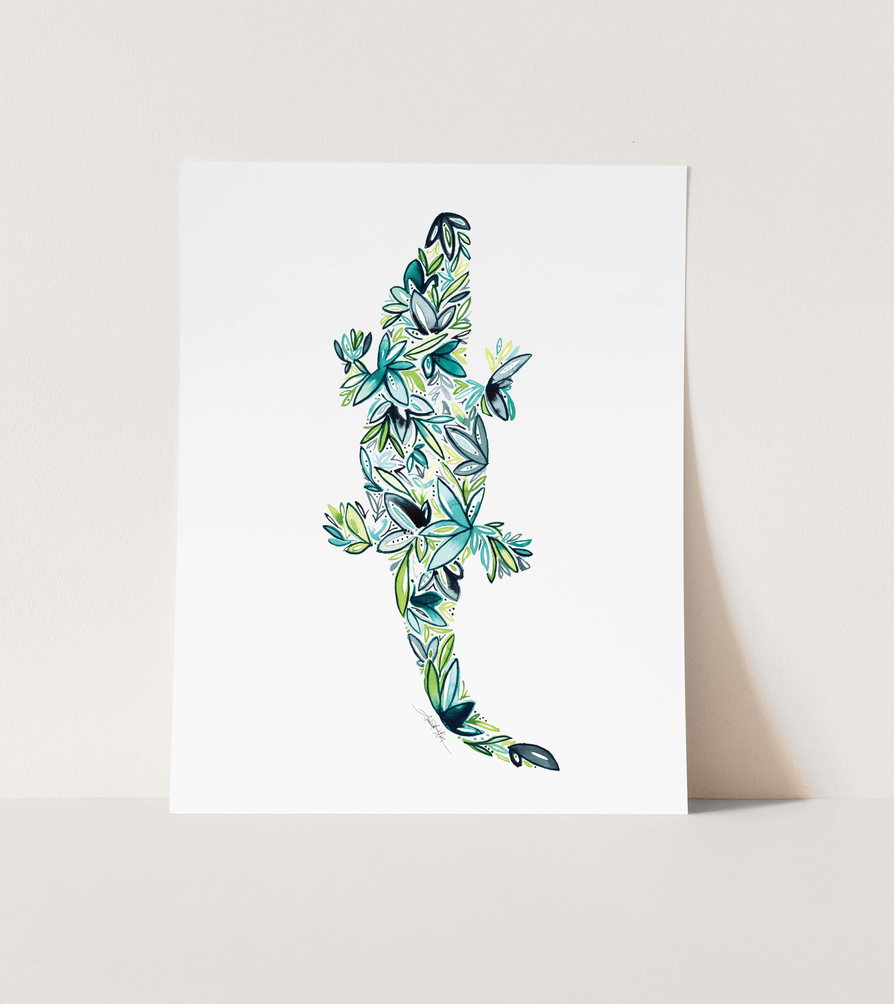 Available as an 8” x 10” or 11” x 14” unframed fine art print, this Alligator art print features a beautiful & bright color palette. This piece has been completed in Amanda Klein’s signature style using liquid watercolor and acrylic ink.