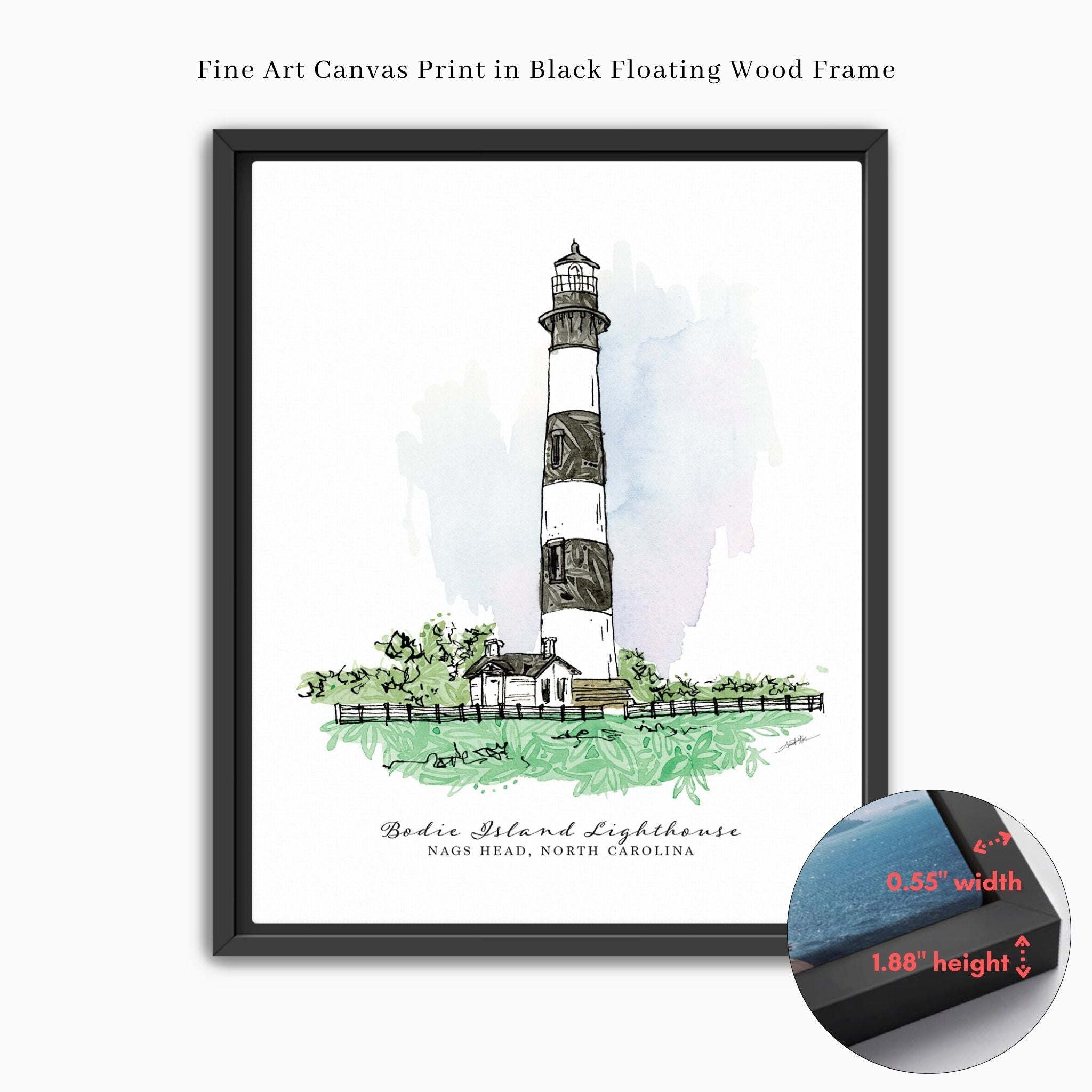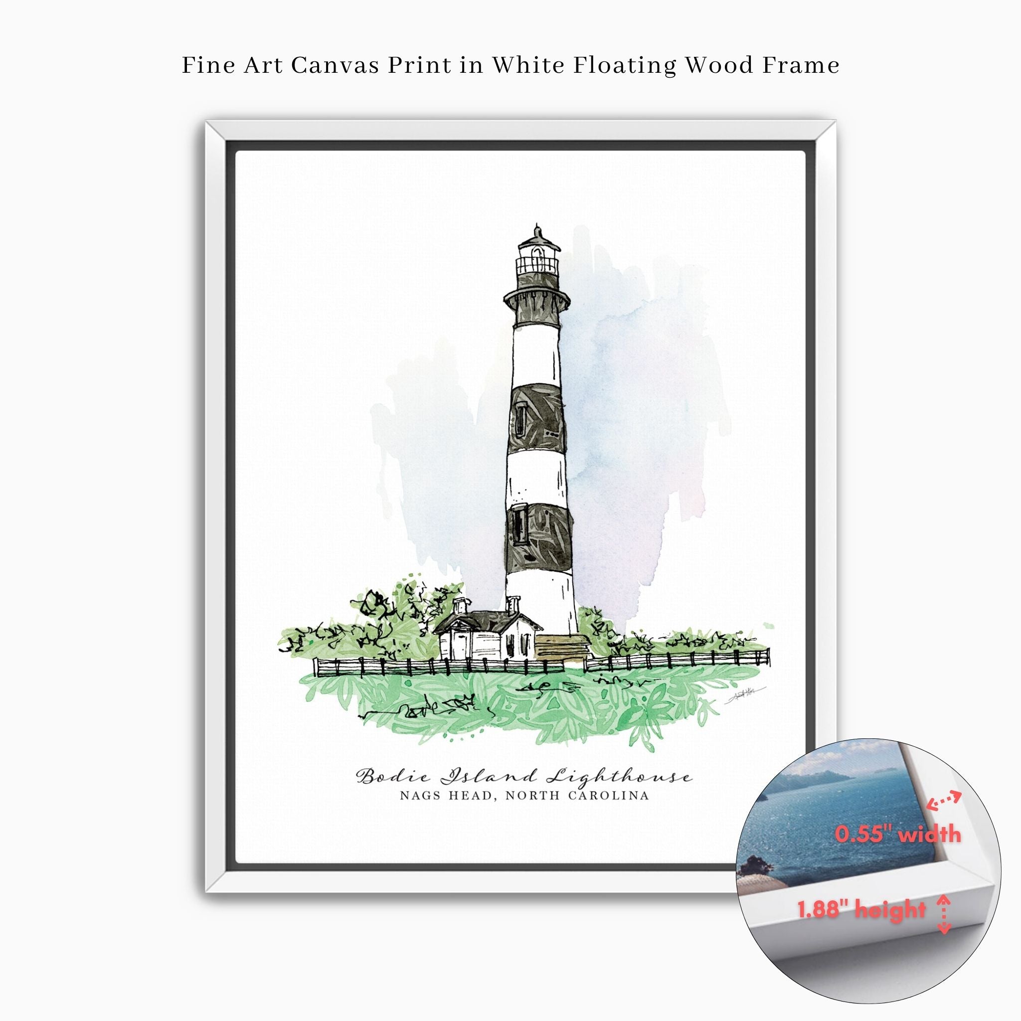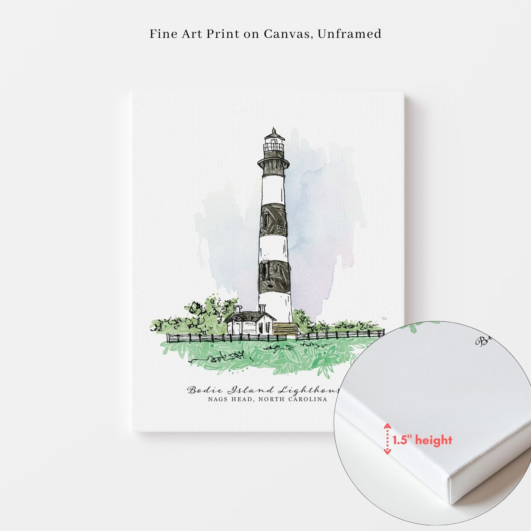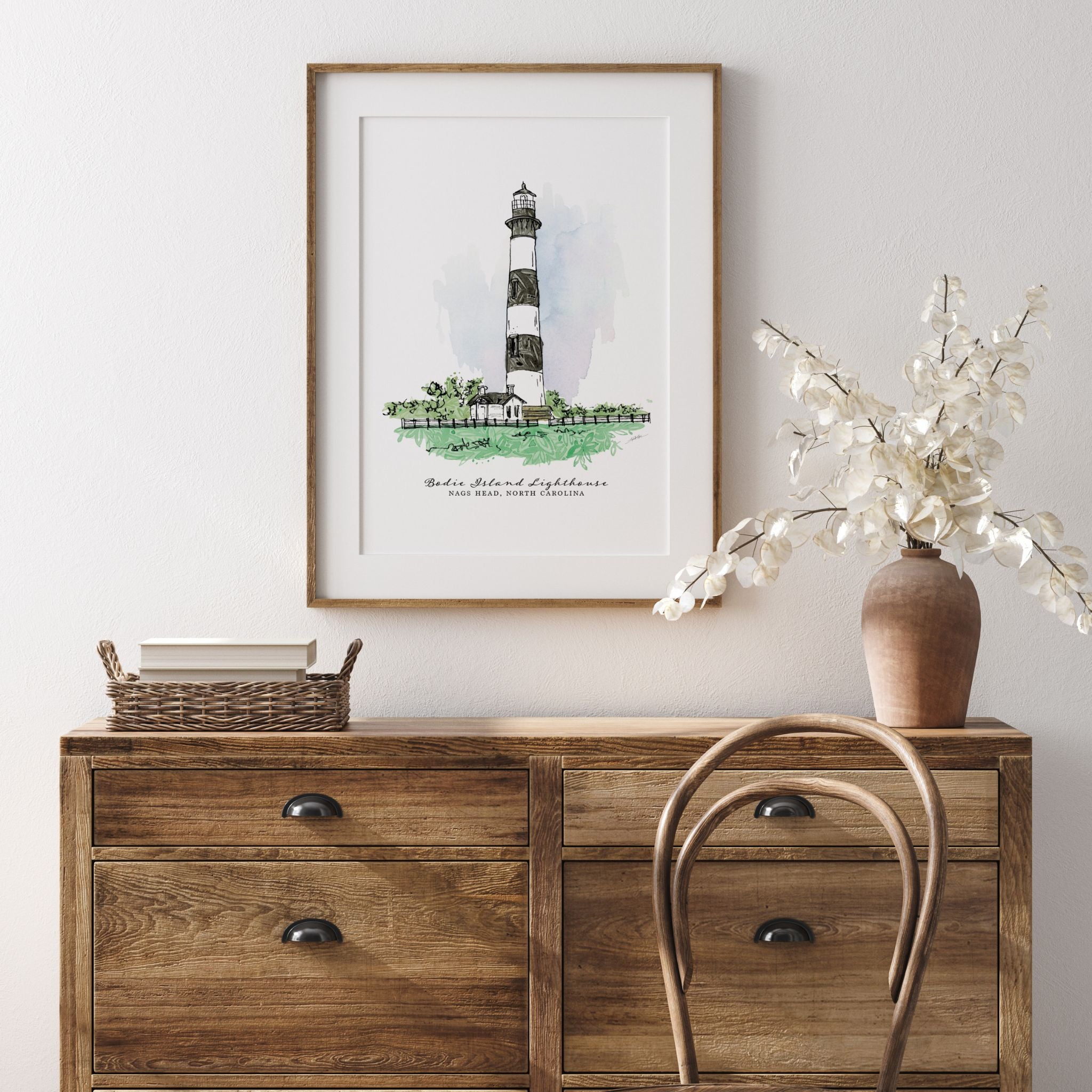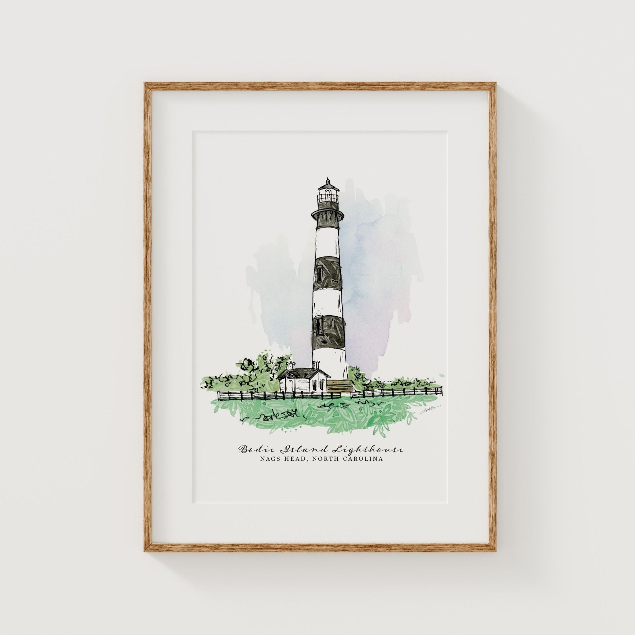 Bring a touch of the coast into your home with this fine art print featuring the iconic Bodie Island Lighthouse. Created with a serene color palette inspired by the Outer Banks.