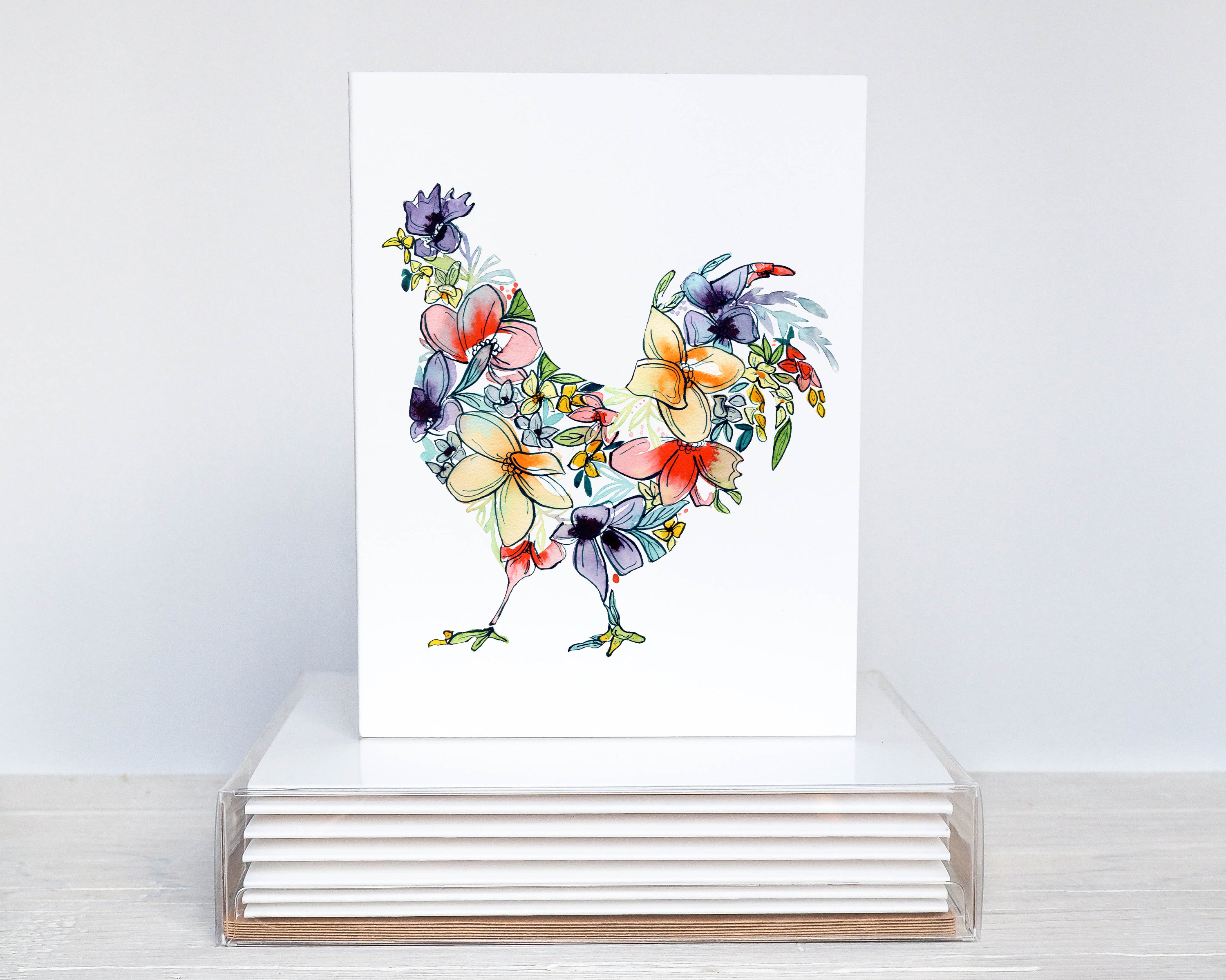 Our Chicken gift box features a delightfully cheerful color palette, completed in Amanda Klein’s signature watercolor style.