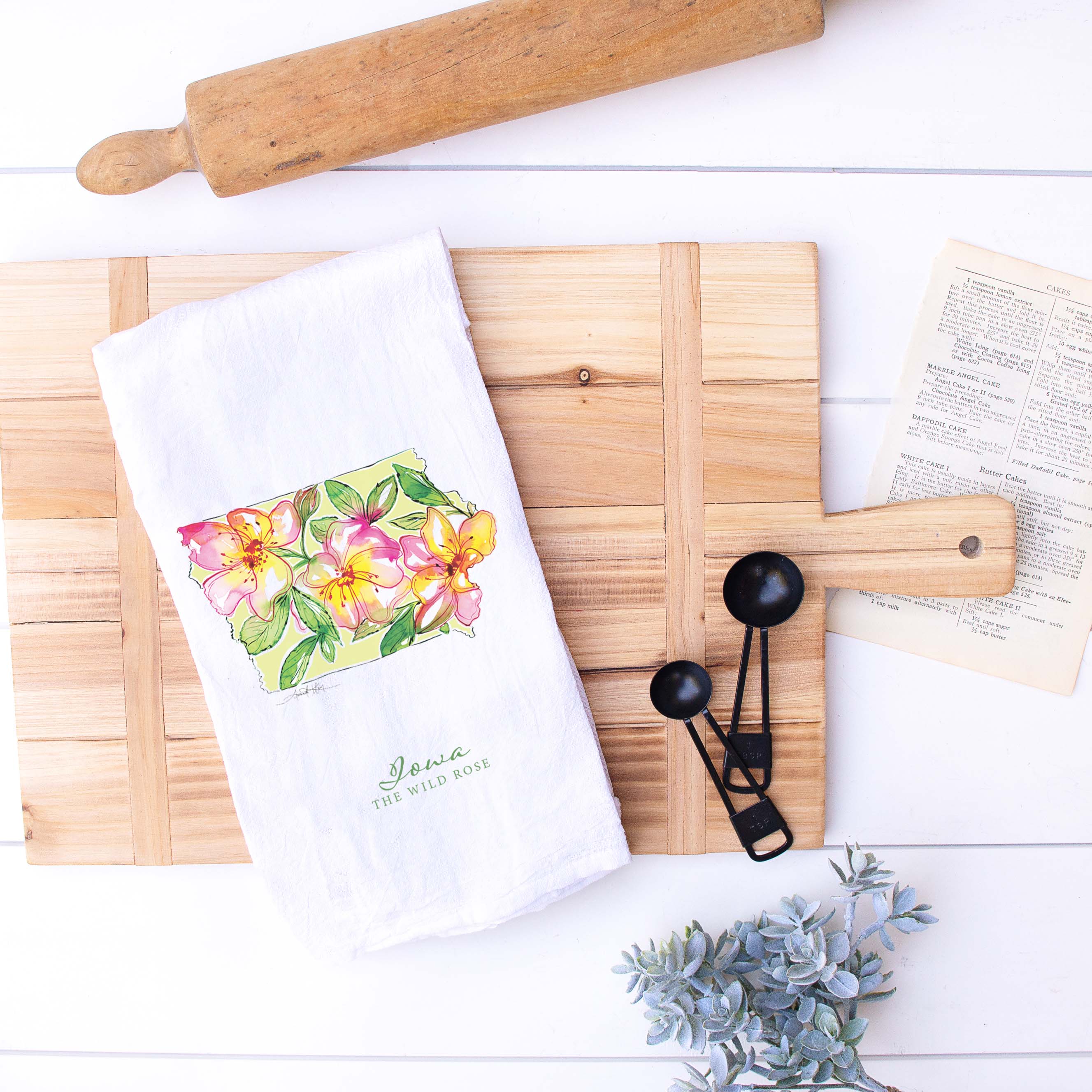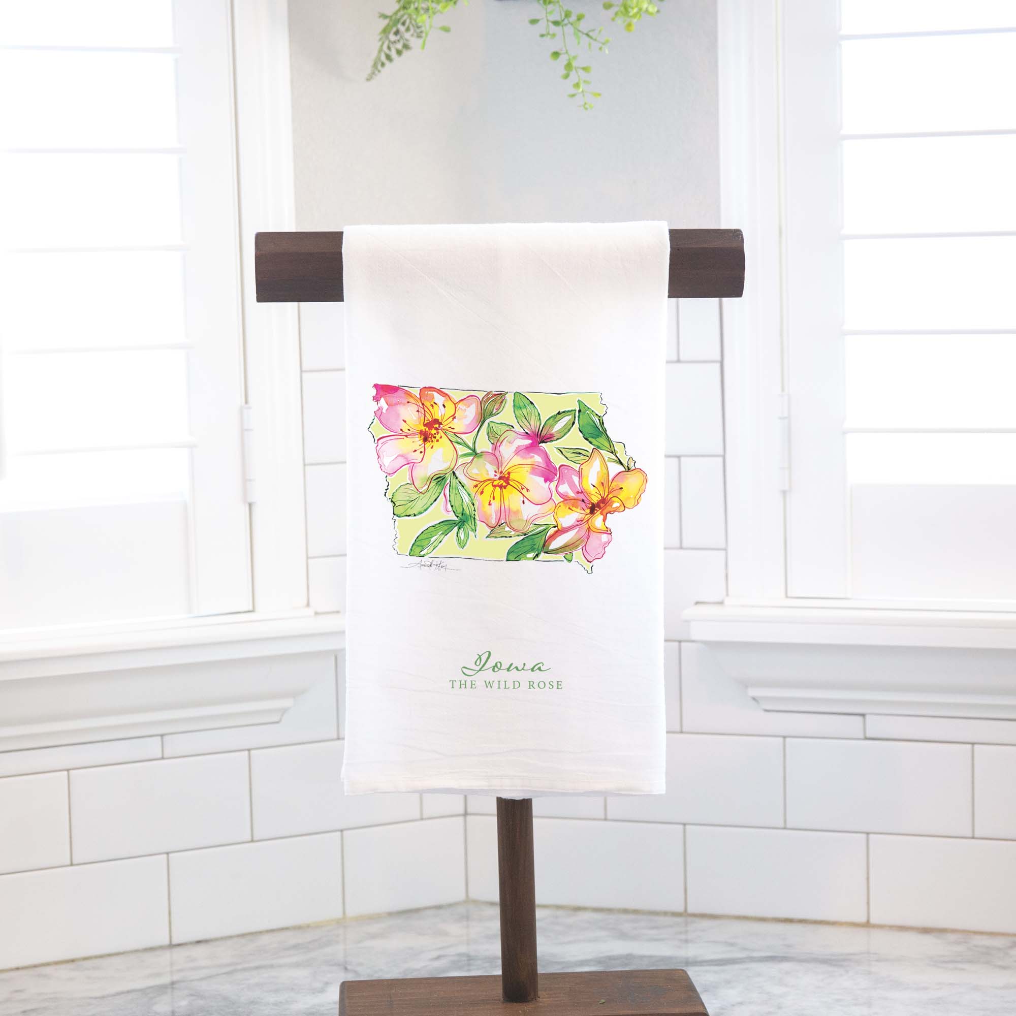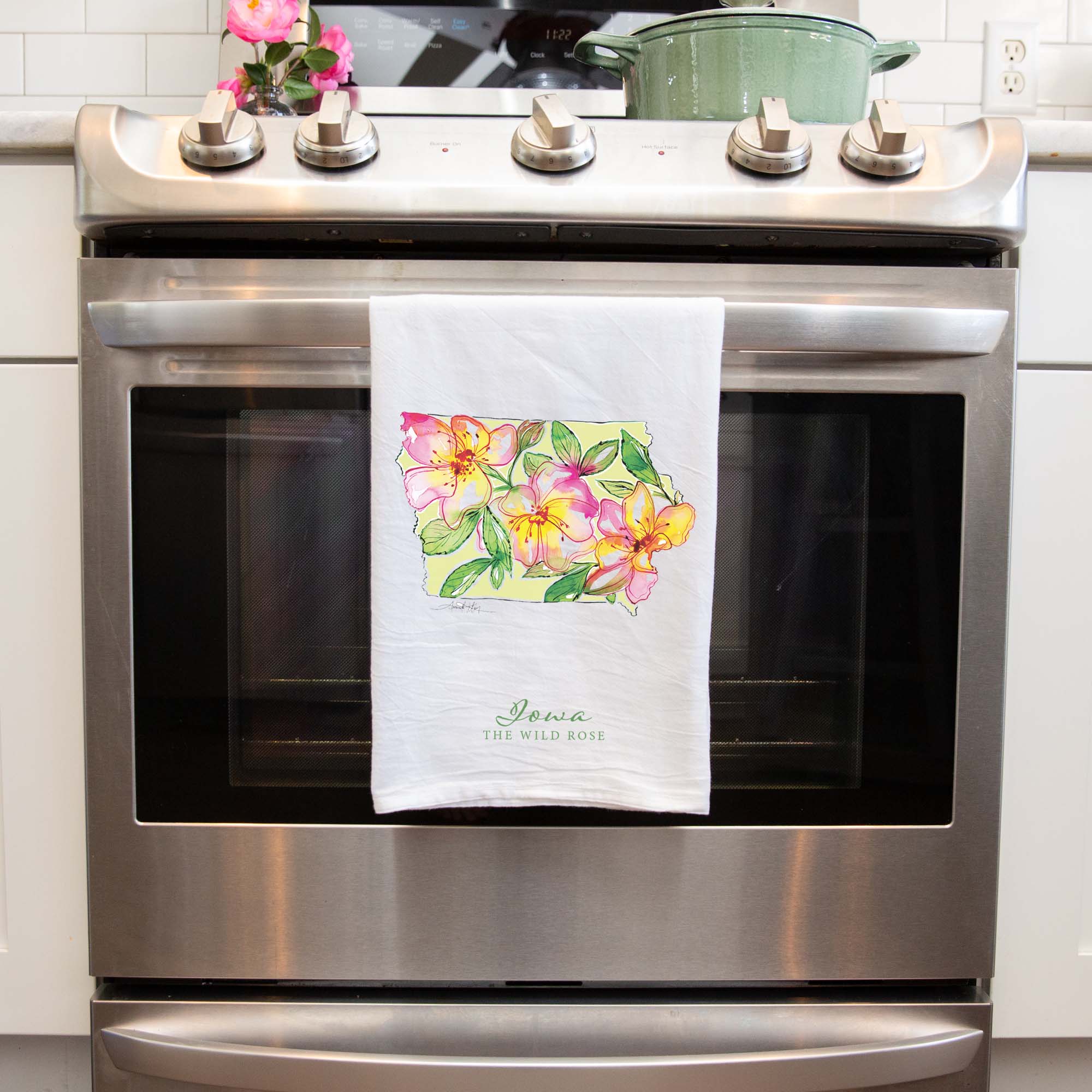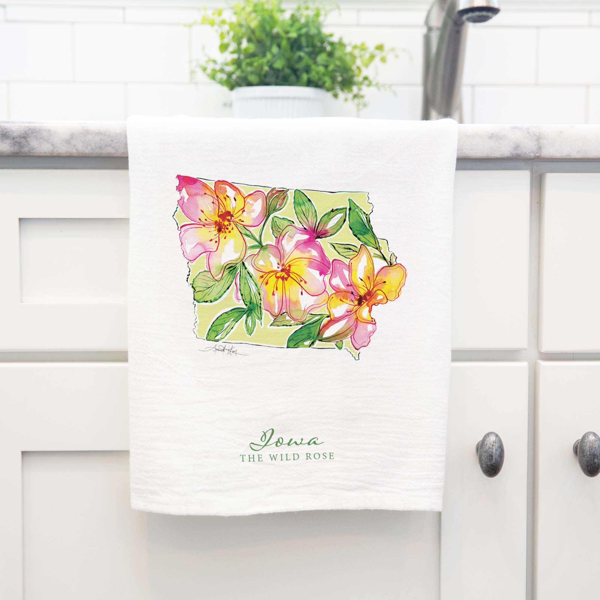 Featuring Iowa's state flower, the Wild Rose, this high quality flour sack tea towel showcases Amanda Klein's whimsical watercolor and splattered design. A uniquely perfect gift for any hostess, bride, teacher, friend, or well-traveled loved one.