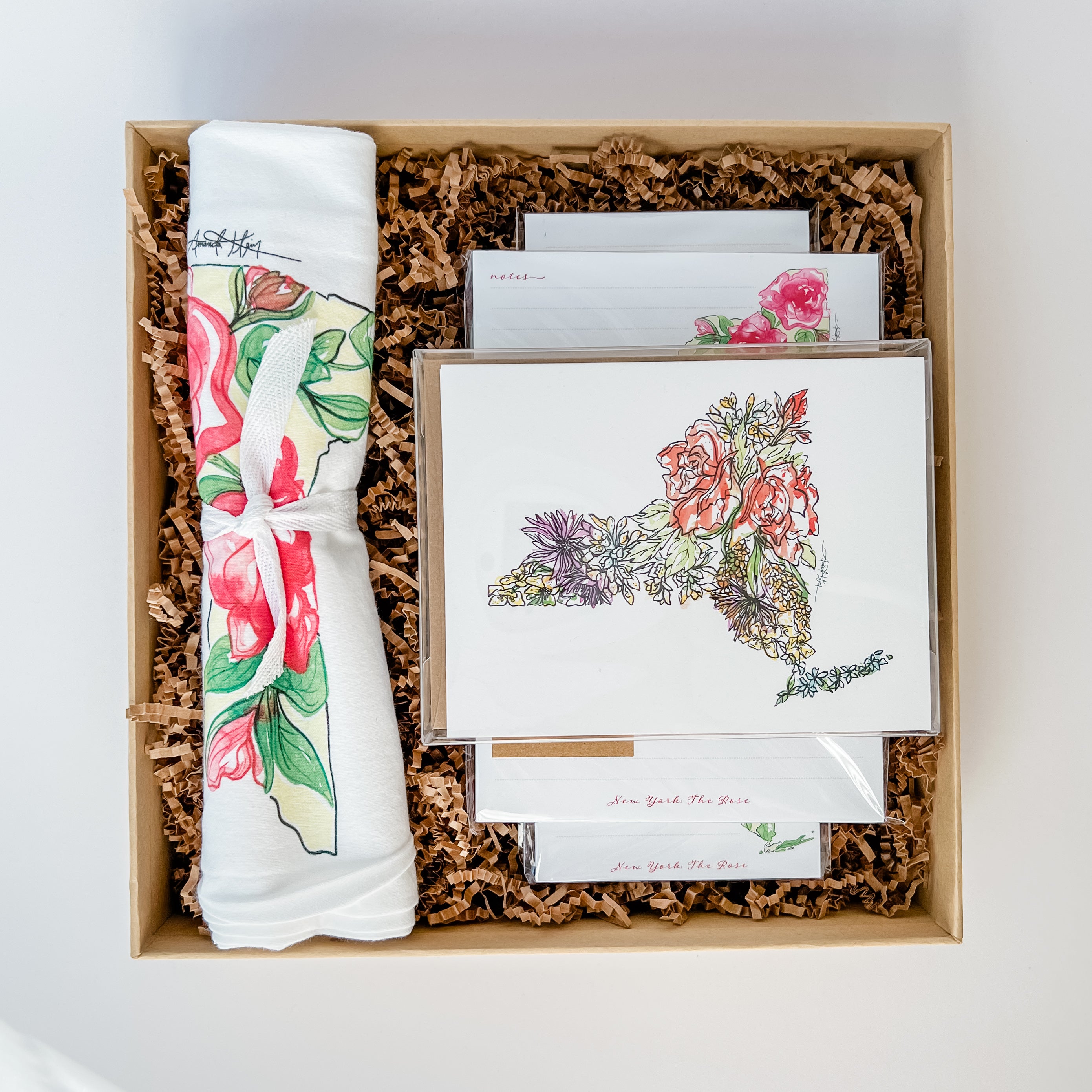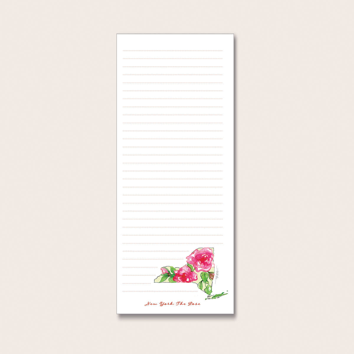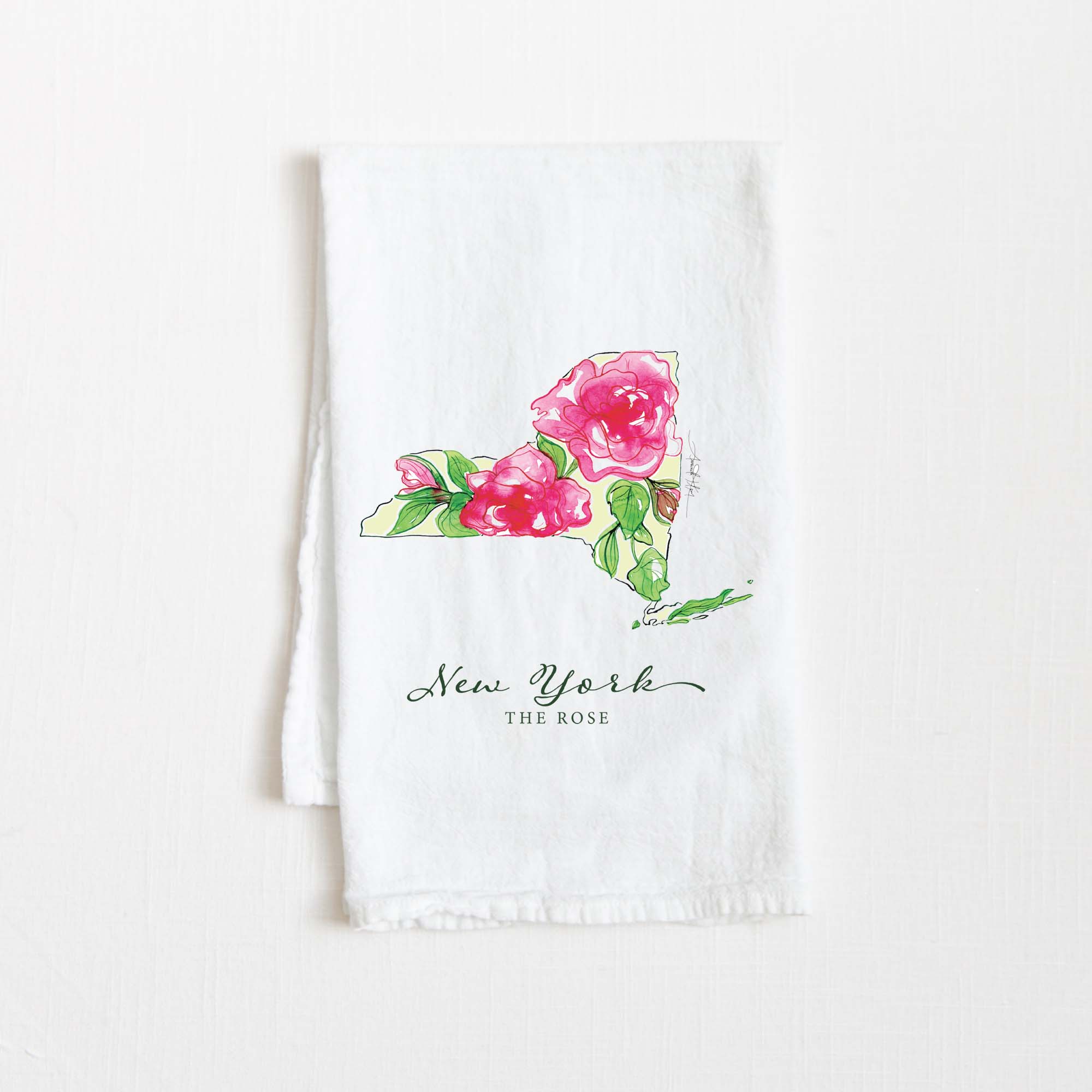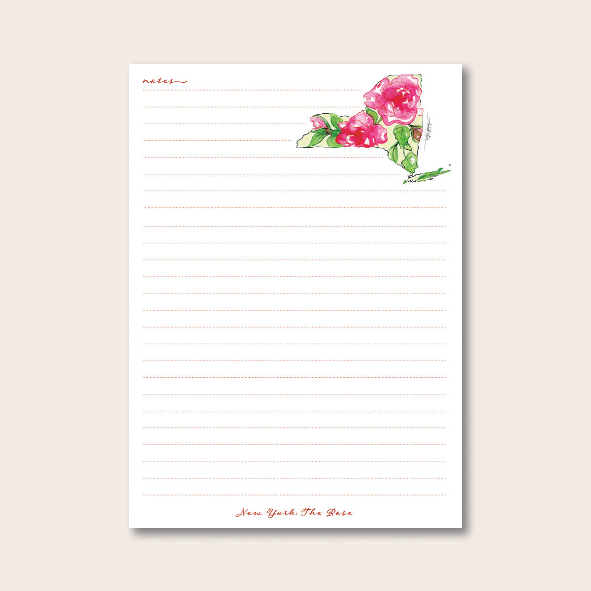 ✨ Flour Sack Towel, Desk Notepad, and Refrigerator Notepad all feature the New York State Flower, the Rose.